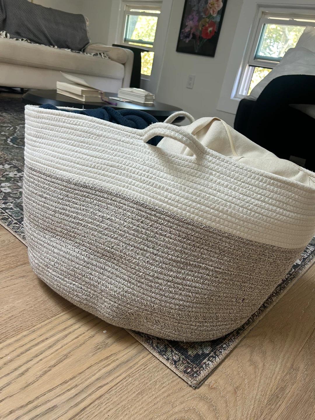 Selling a large woven rope basket in neutral colors. It's in great condition and perfect for storage or decor! The basket is sturdy and has a nice, clean look. It would be great for organizing blankets, toys, or laundry. Stuff inside not included…just used it to show its shape when full.