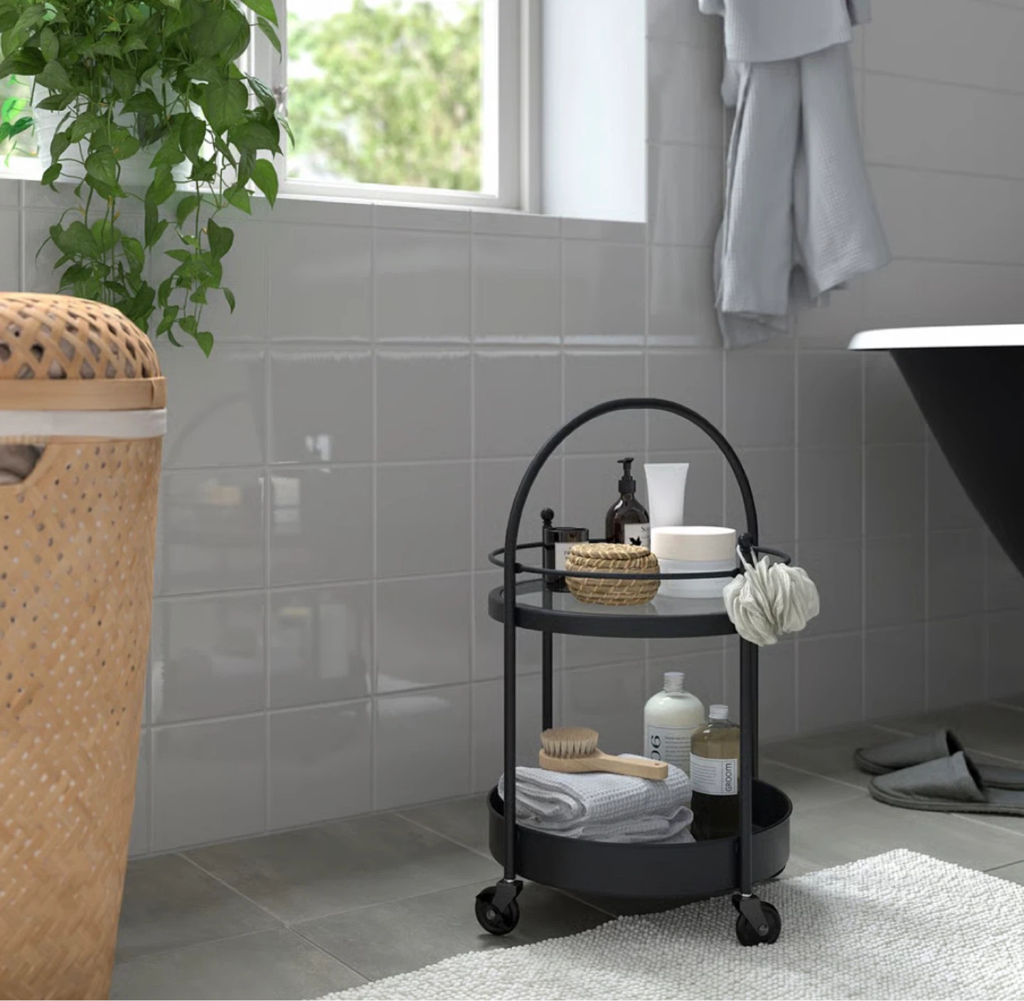 Black metal two-tier bar cart with glass top shelves. It features rolling wheels for easy mobility. This cart is perfect for serving drinks or as a decorative display piece.