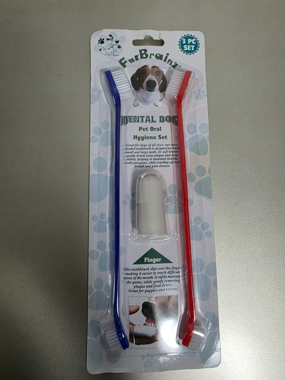 Dual-headed toothbrush designed for dogs of all sizes. Soft bristles gently remove plaque and food debris. Includes finger toothbrush for easy access to difficult areas.