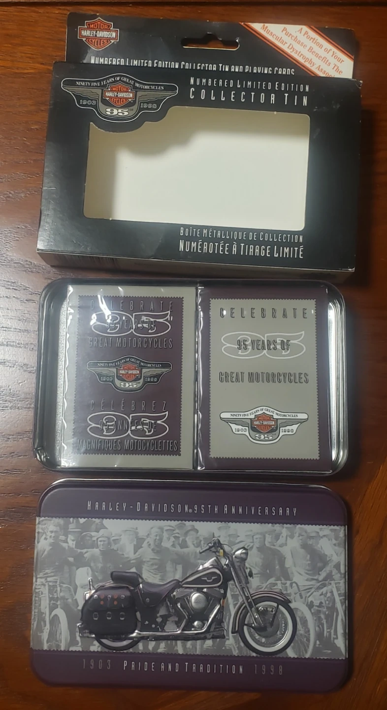 This is a Harley-Davidson 95th Anniversary collector tin Tin & Playing Cards. It celebrates ninety-five years of great motorcycles. This limited edition tin features a classic Harley motorcycle design. The cards are unopened.