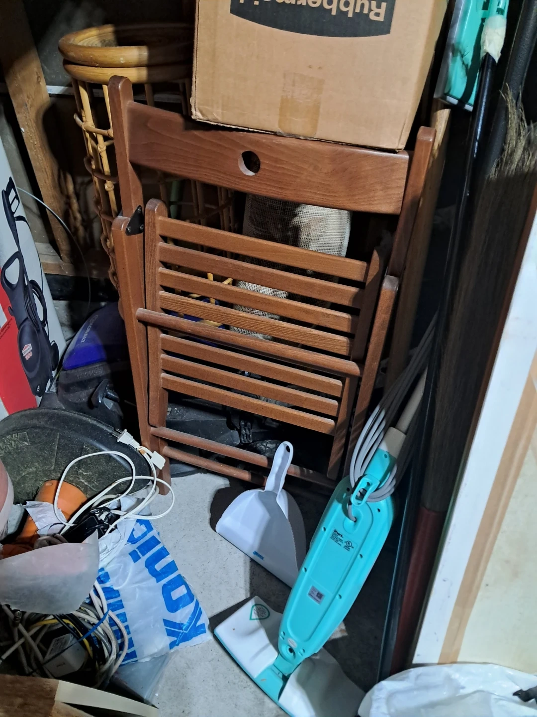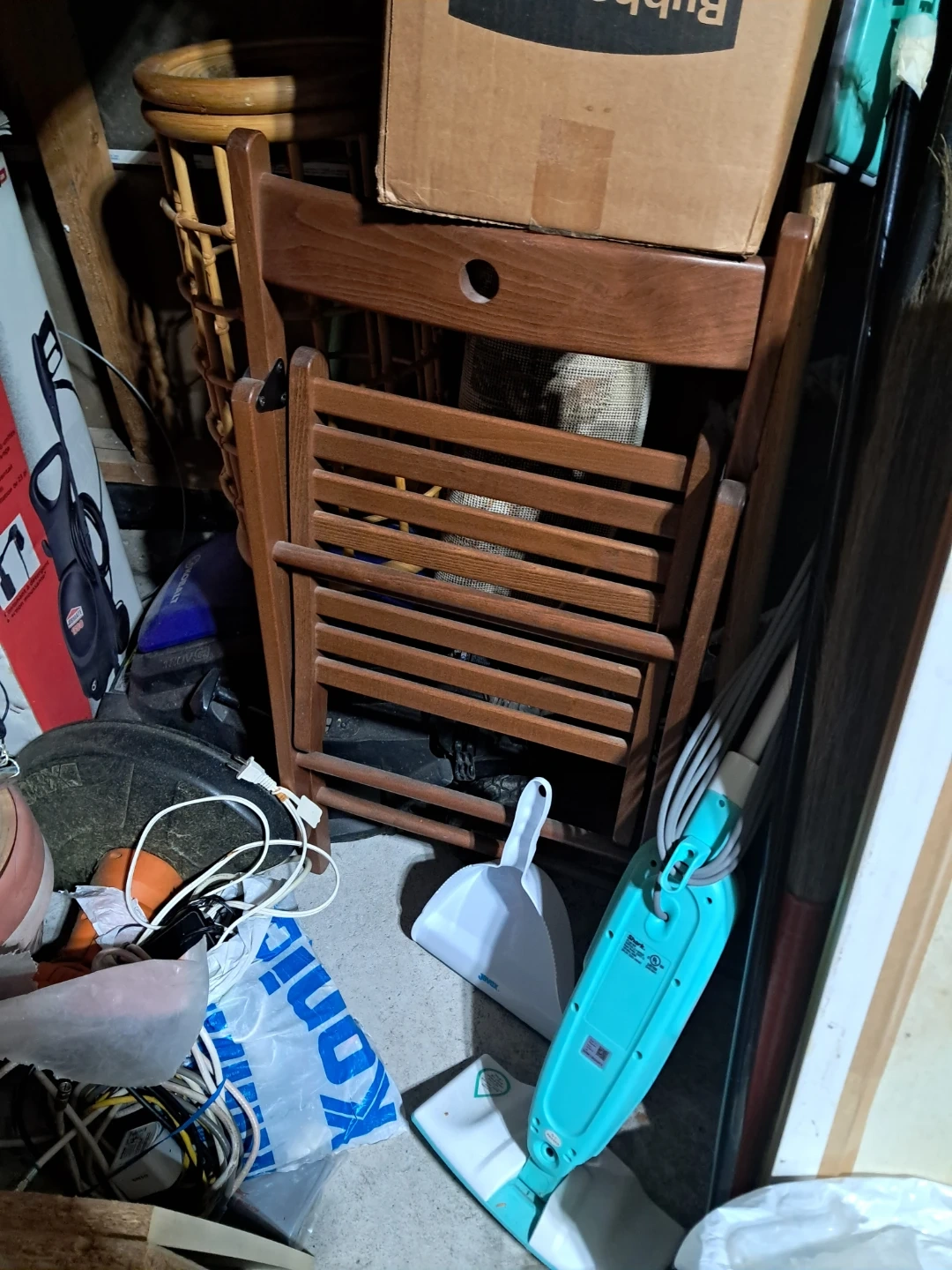 Selling a wooden folding chair. It's perfect for extra seating when you have guests over or for small spaces where you need a chair that can be easily stored away when not in use. This chair is sturdy and in good condition, ready to be used in your home