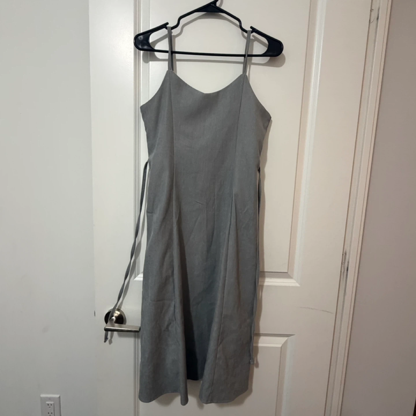 Clean and elegant grey midi dress with thin straps and a flattering silhouette.
