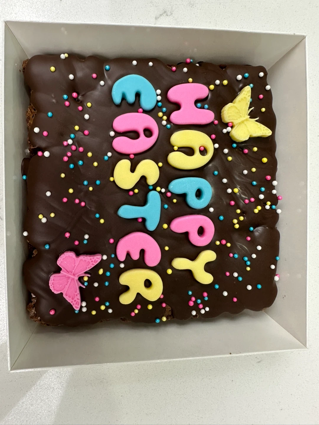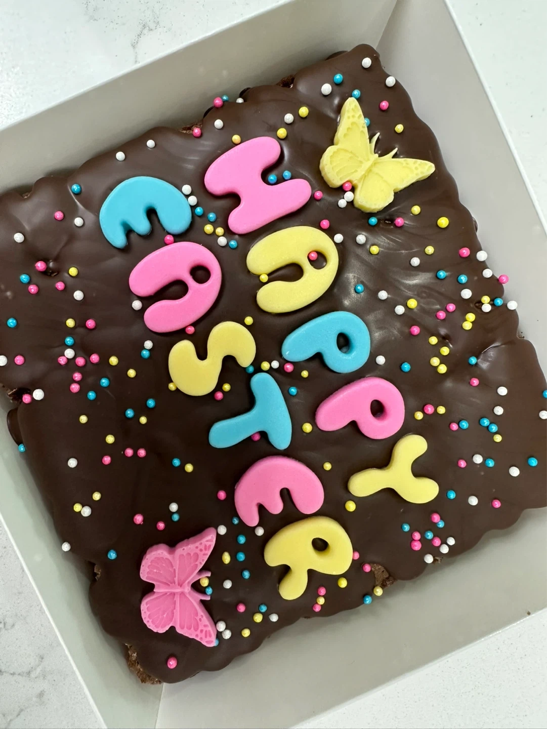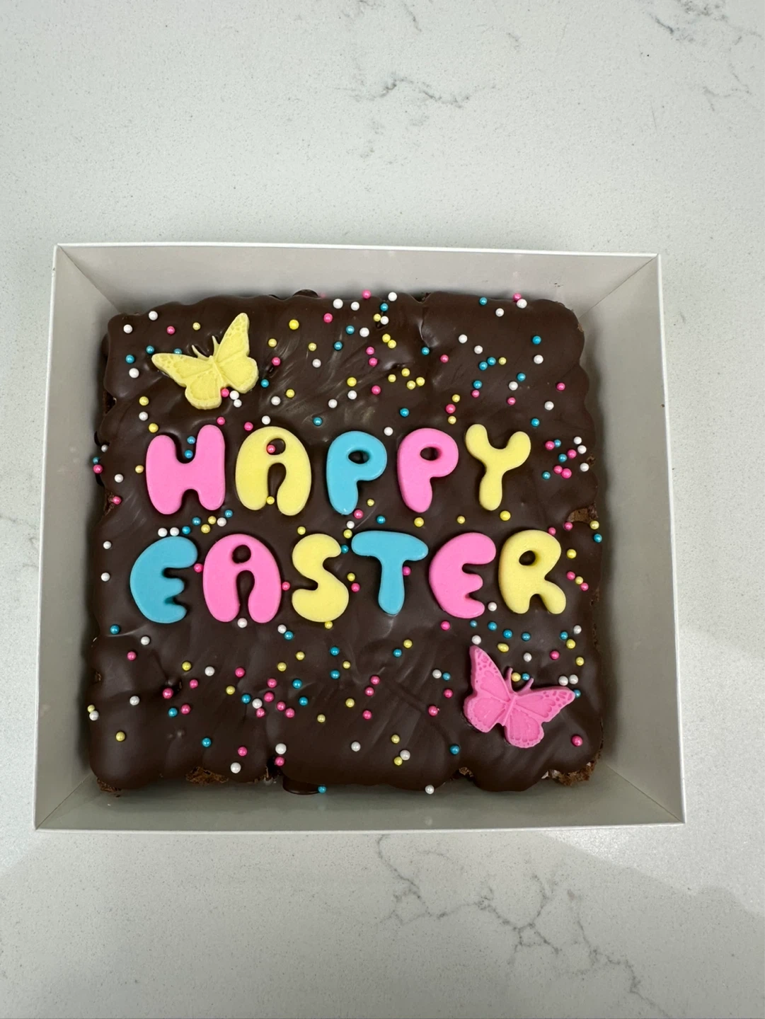 A delicious fudgy chocolate brownie topped with milk chocolate and chocolate colourful "Happy Easter" letters and cute butterflies and sprinkles. Perfect for your Easter celebrations! 4.5” by 4”