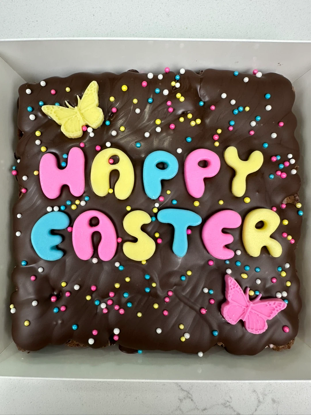 A delicious fudgy chocolate brownie topped with milk chocolate and chocolate colourful "Happy Easter" letters and cute butterflies and sprinkles. Perfect for your Easter celebrations! 4.5” by 4”