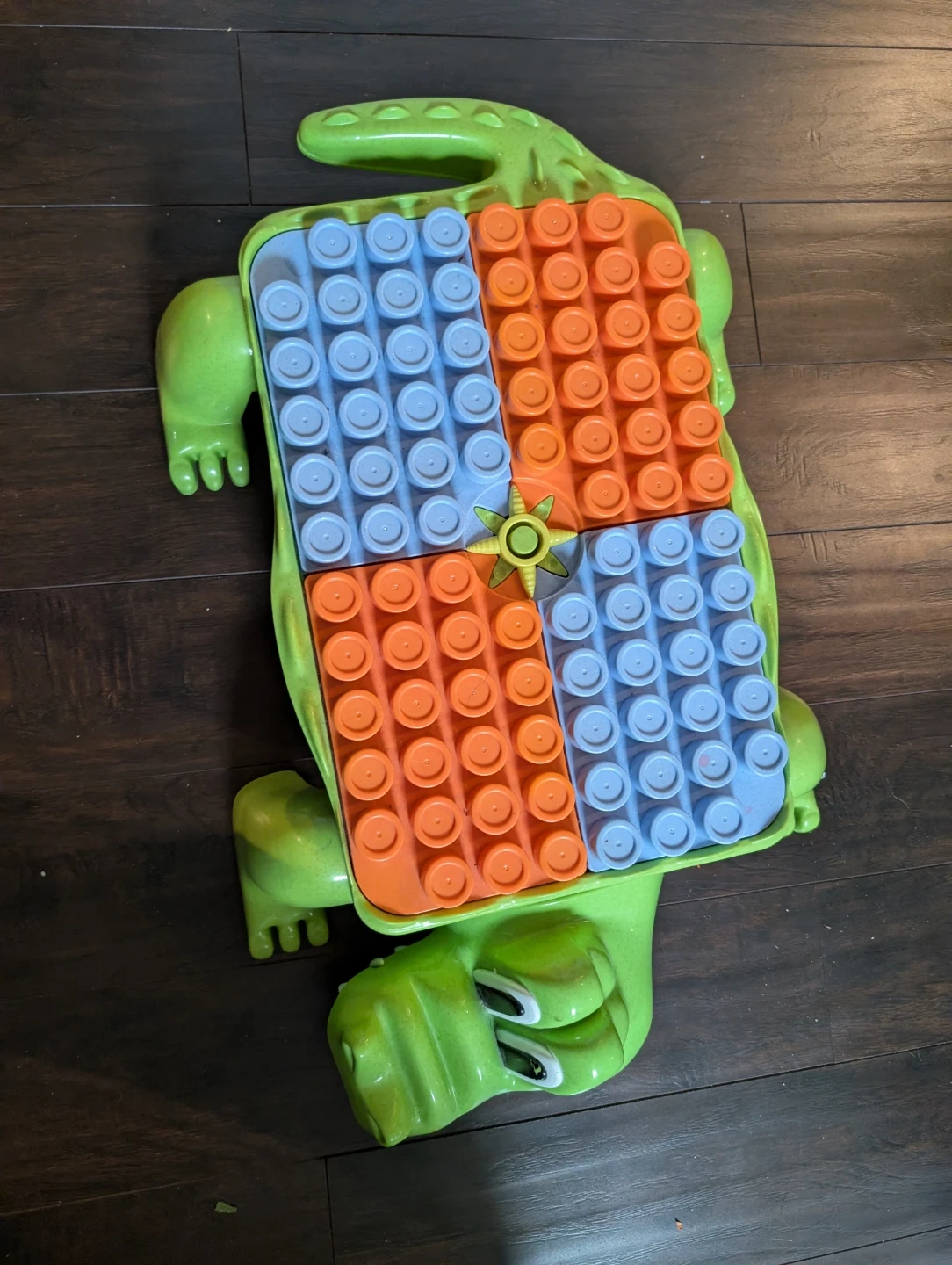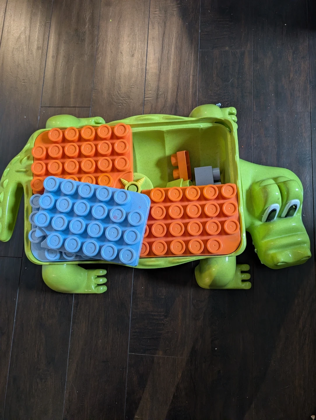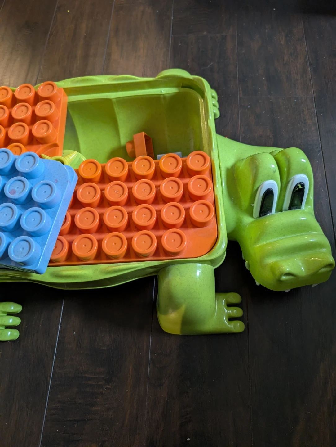 A fun green alligator-shaped toy case perfect for storing building blocks. It includes orange and blue building plates. This case helps keep play areas tidy!