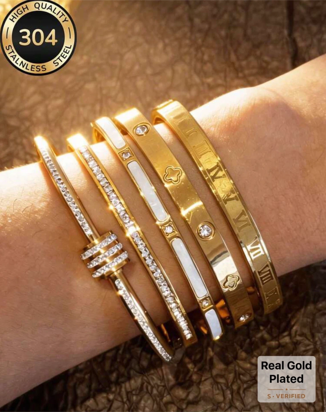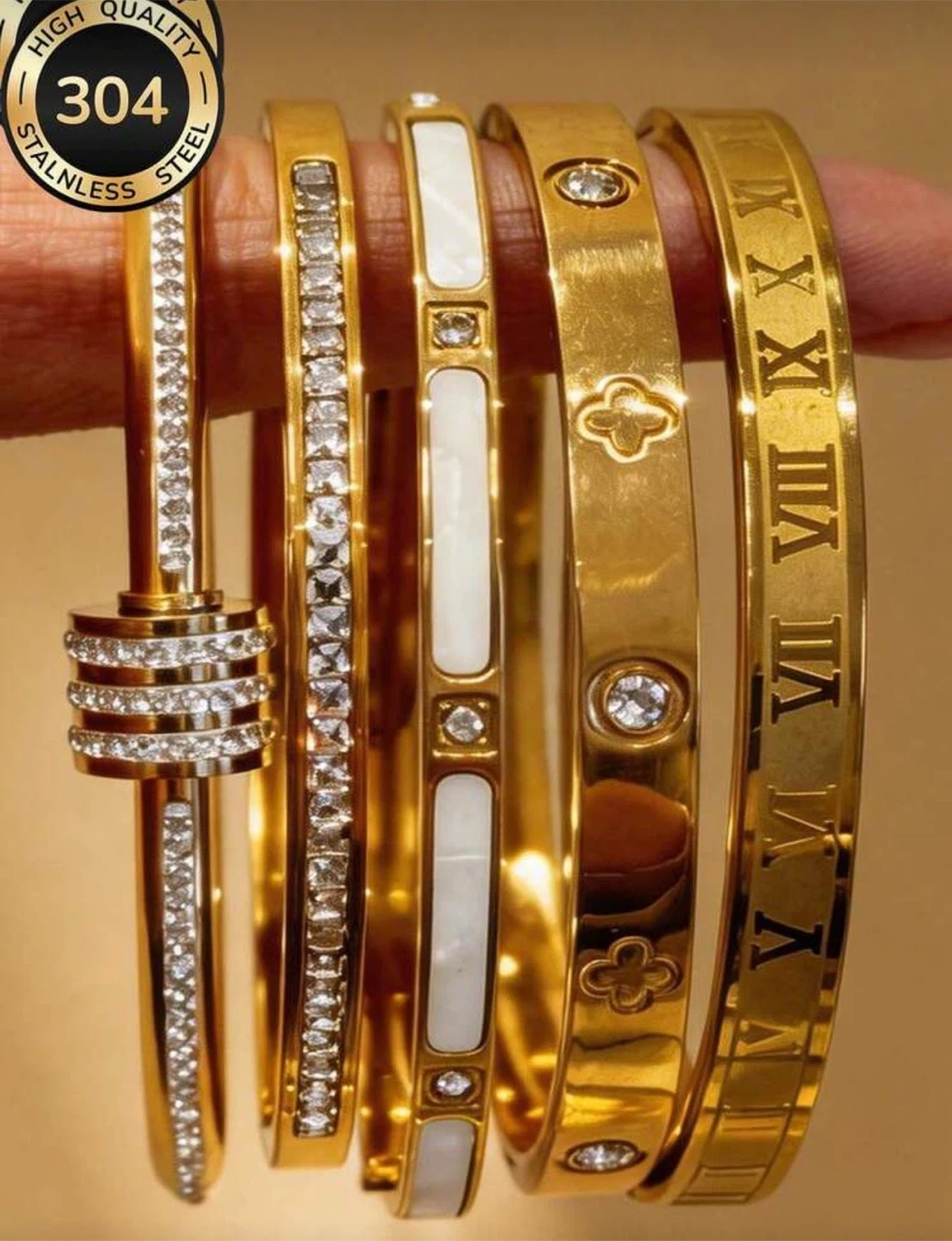 Five gorgeous gold-toned bracelets, made with 304 stainless steel. They're real gold plated and feature assorted designs including clear rhinestones, white enamel inlays, clover patterns, and Roman numerals. This set offers a stylish variety for your wrist!