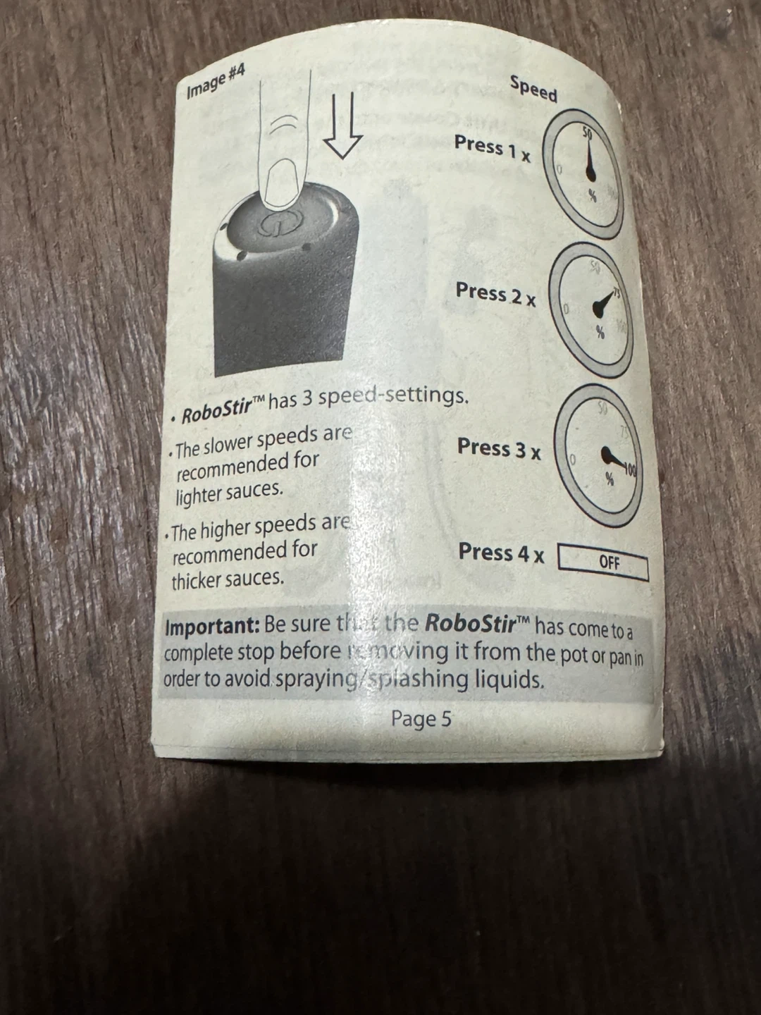 This RoboStir has 3 speed settings, great for lighter or thicker sauces. Ensure it's completely stopped before removing from the pot. It's battery-operated and helps keep your sauces from sticking. Located in Oliver