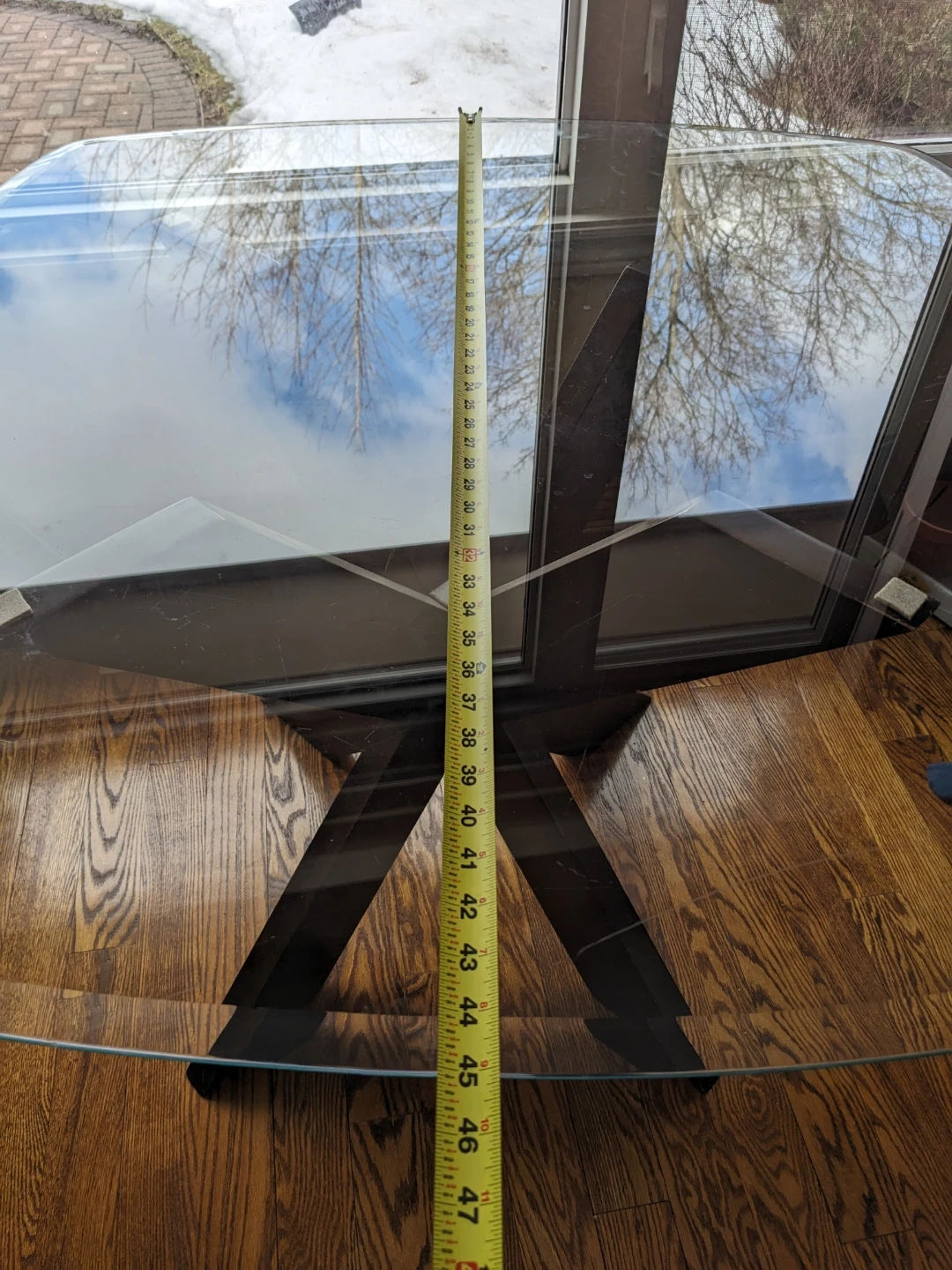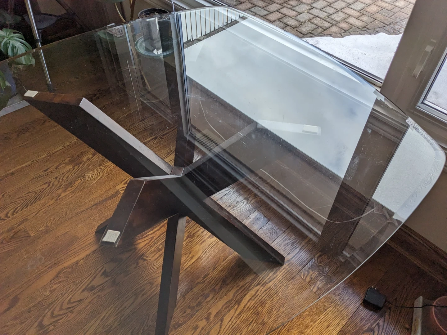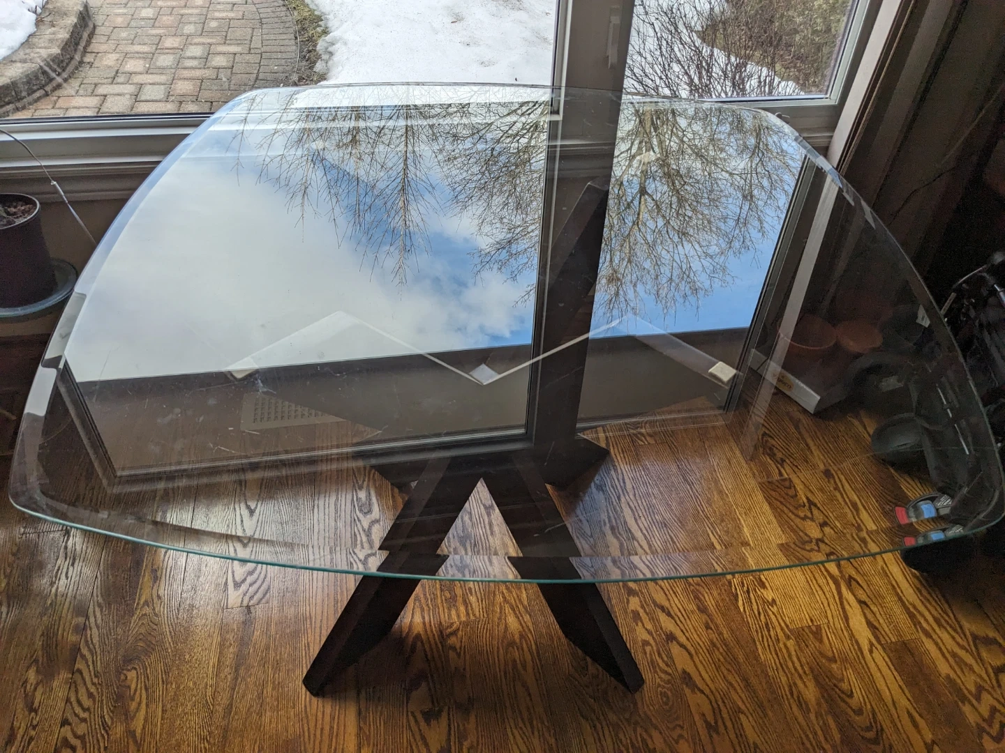 Glass top dining table with a unique X-shaped dark wood base. Table measures in the photos. It's a stylish addition to any dining space!