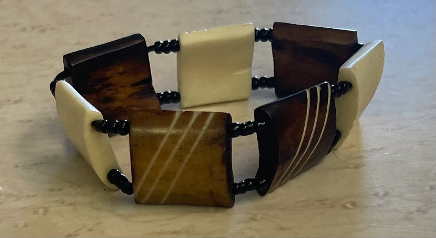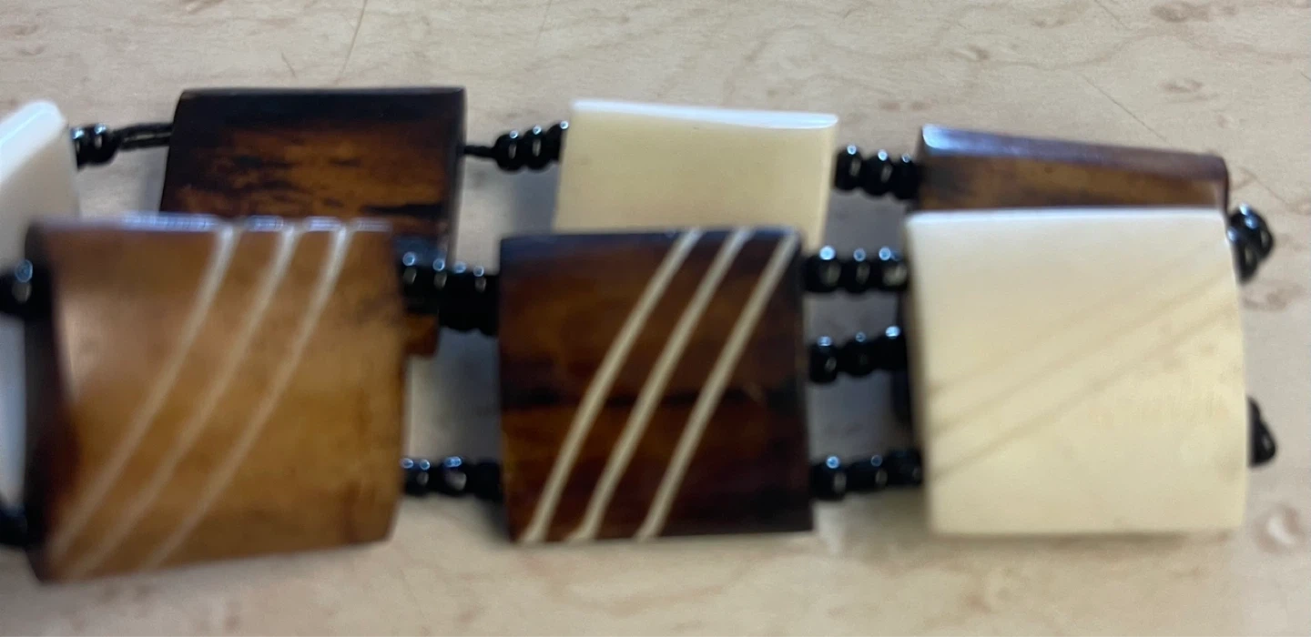 Stretch bracelet featuring square beads in cream and dark brown tones. Some beads have decorative carved lines. It's strung on black elastic cord with small black accent beads. Cash only