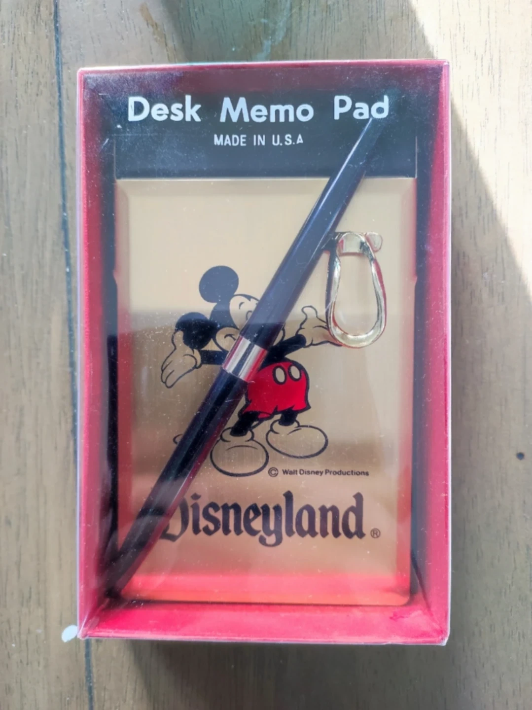 This Disneyland desk memo pad features Mickey Mouse. It includes a pen with a gold clip. Made in U.S.A. Perfect for jotting down quick notes or reminders!
