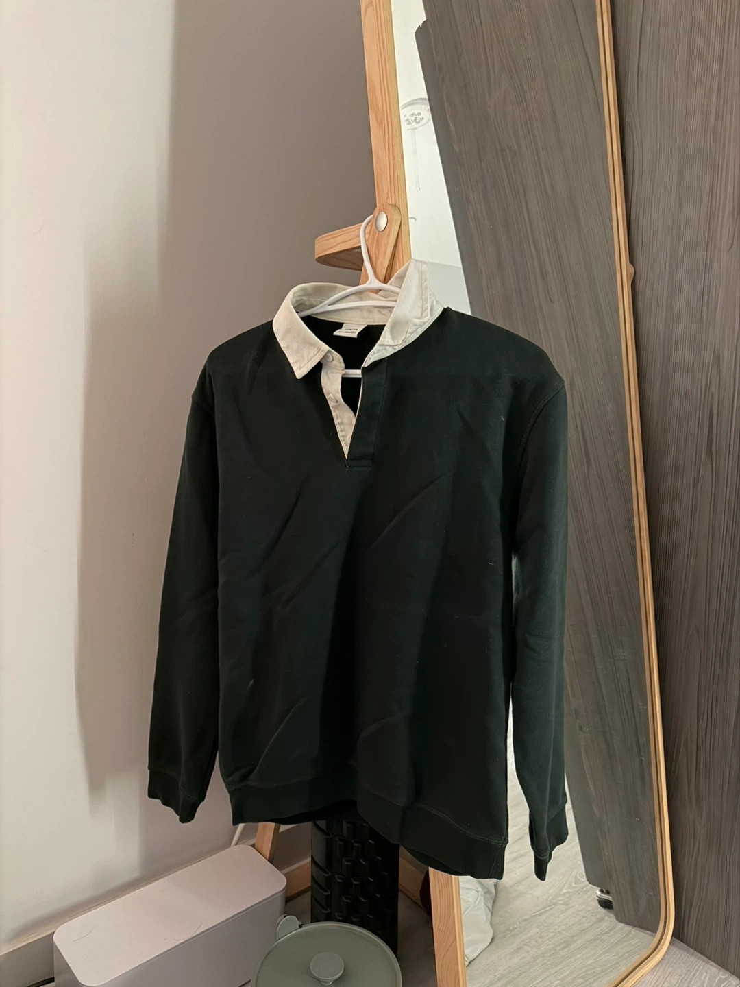 Dark green long-sleeved rugby shirt from ZARA. It's got a classic white collar with a button placket. This shirt is made of a comfy cotton blend.