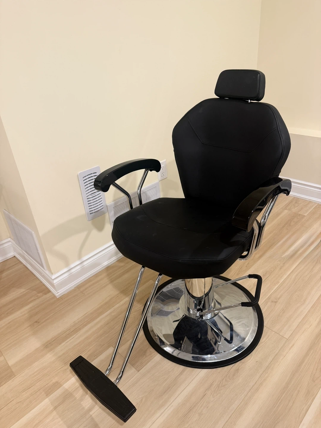 A professional styling chair upholstered in black faux leather. It features adjustable height, comfortable armrests, and a removable headrest. The sturdy chrome base includes a footrest for client comfort. This chair is suitable for salons or barbershops.