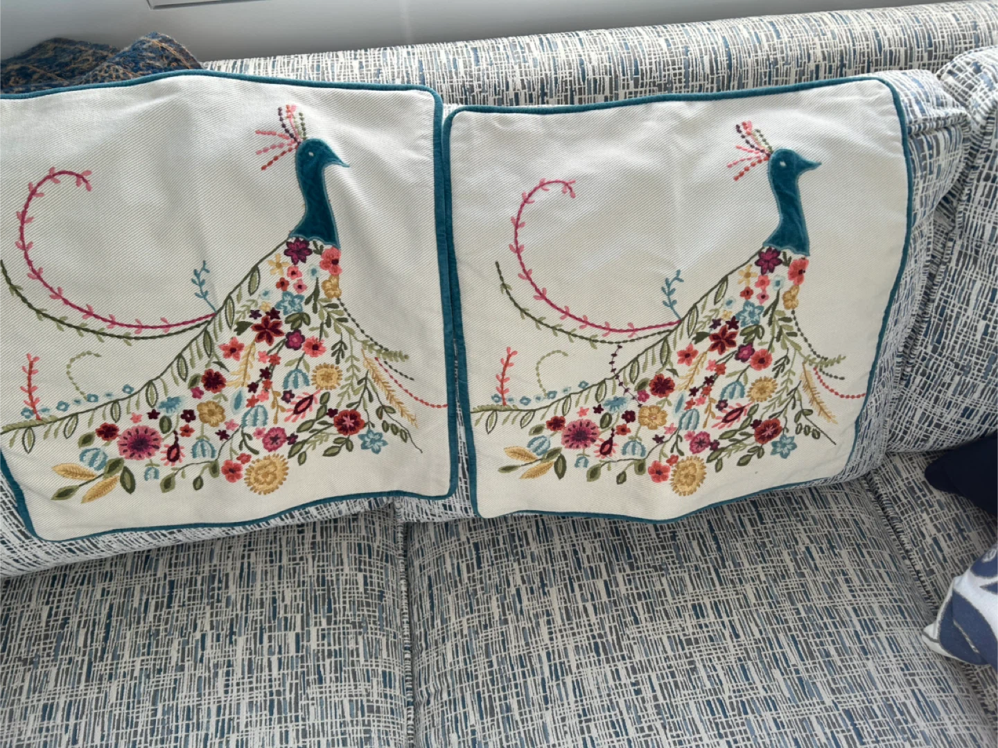 These beautiful peacock accent pillow covers are like new. The trim is turquoise velvet. No rips or wear marks. The multi coloured pattern will suite any decor reflecting style and a touch of whimsy.