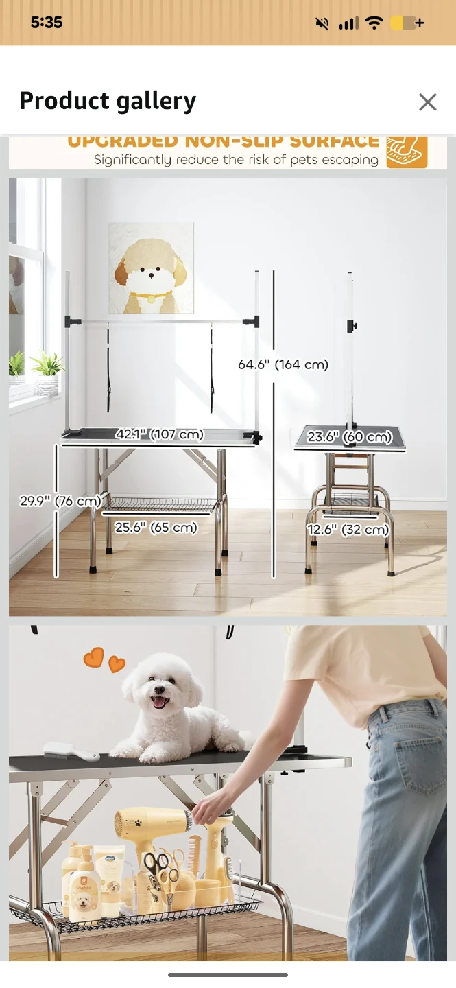 This professional grooming table features a non-slip surface, perfect for keeping pets secure. It's designed with a sturdy stainless steel frame and includes an adjustable arm and leash for convenient grooming. The table is foldable for easy storage.