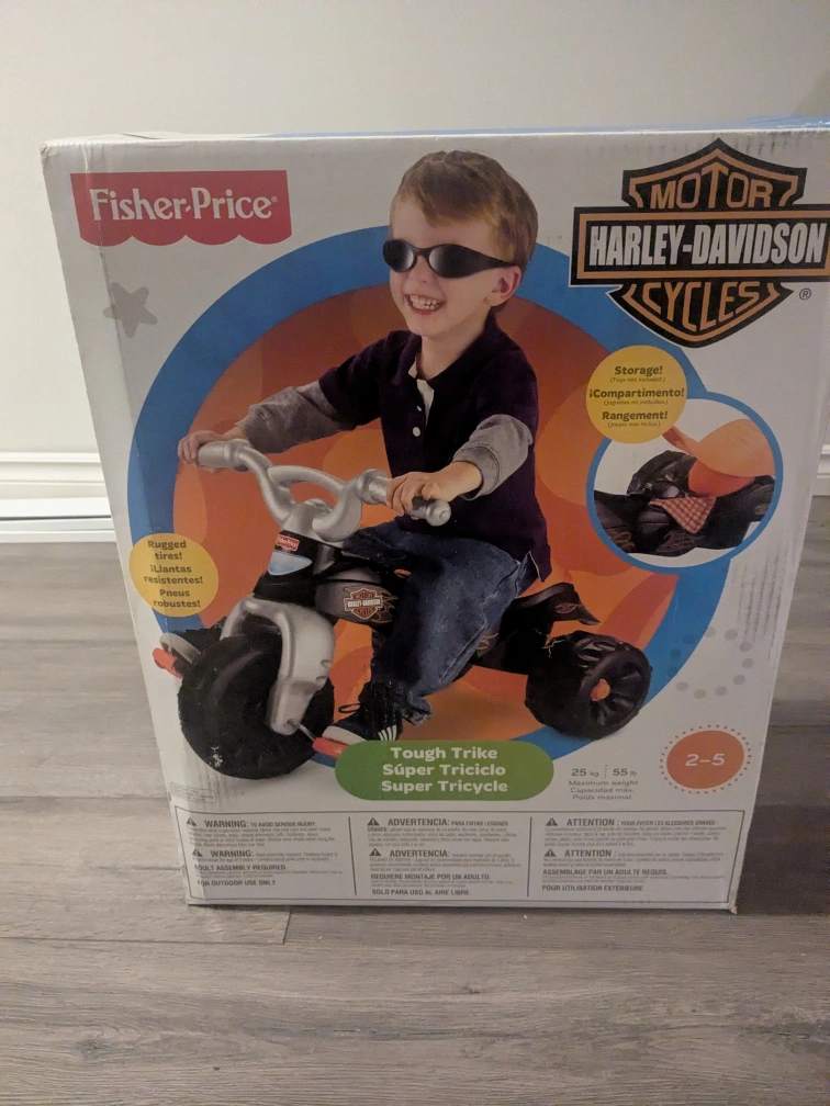 Selling a Fisher-Price Harley-Davidson Tough Trike! It's suitable for kids aged 2-5 years. This trike has rugged tires and a storage compartment. The box is included! Never opened!