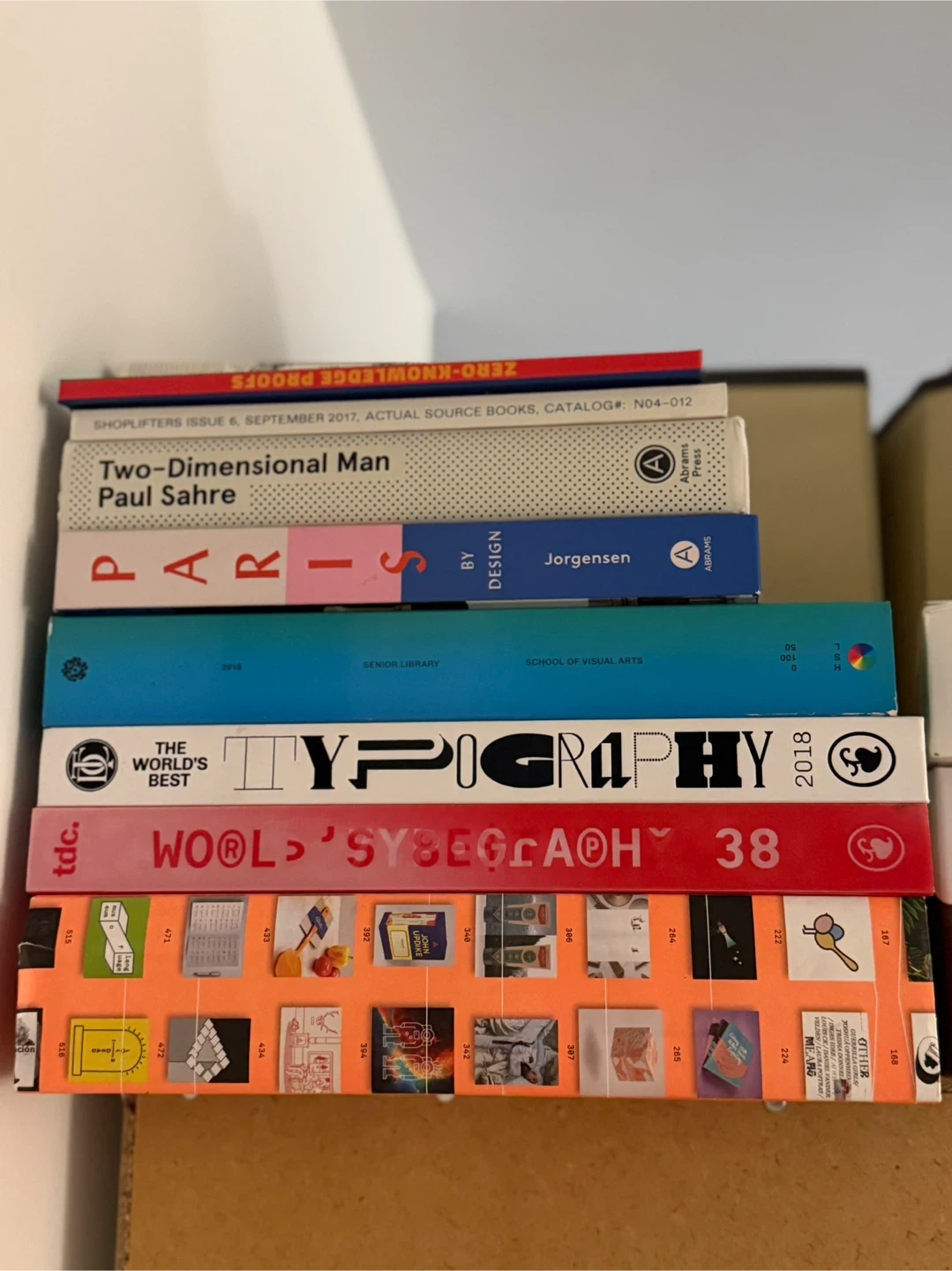 Bundle of assorted art and design books, including titles like 'Two-Dimensional Man' and 'Typography 2018'. Contents cover various design subjects. Books sold as a set. $10each