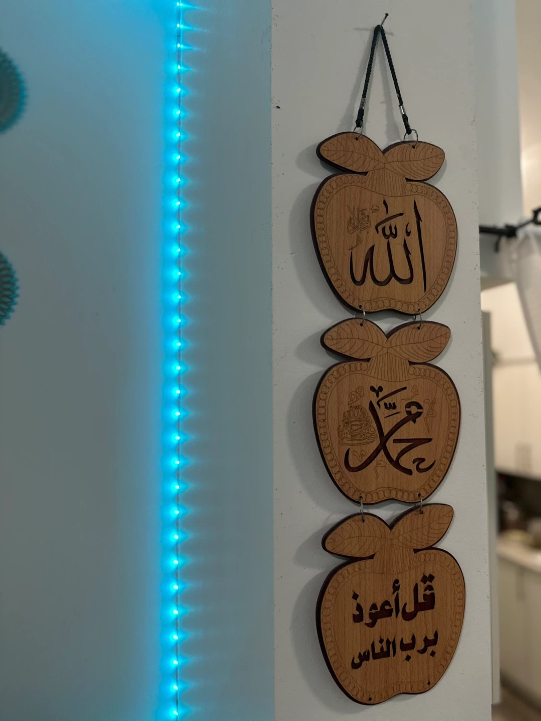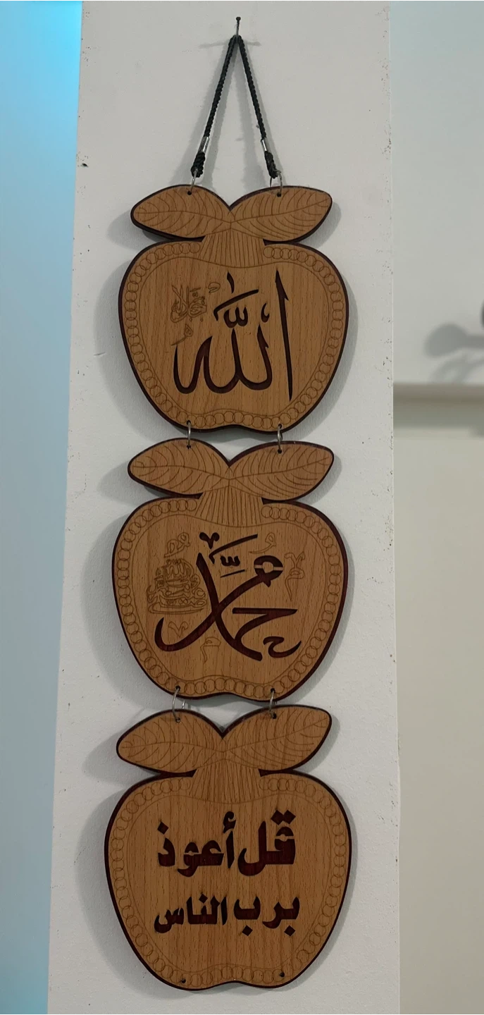 Beautiful wood apple shaped decoration with Quran verse and beloved names in Islam, perfect to put in living room or anywhere in your home to make your walls stand out more and not look empty