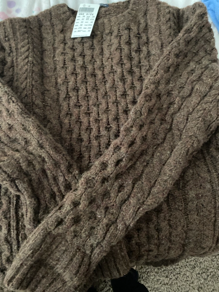 A brown cable knit sweater. It's one size and very soft.