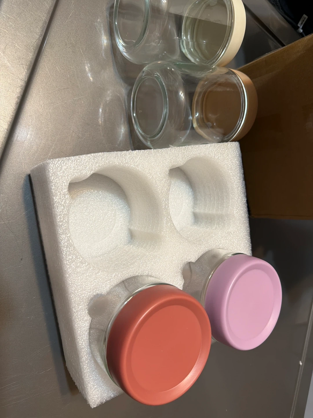 Set of four glass jars with colourful lids, perfect for overnight oats or storage. Each jar is 500ml/16 oz capacity and comes with a secure lid. These jars are great for packing lunches or storing small food items.