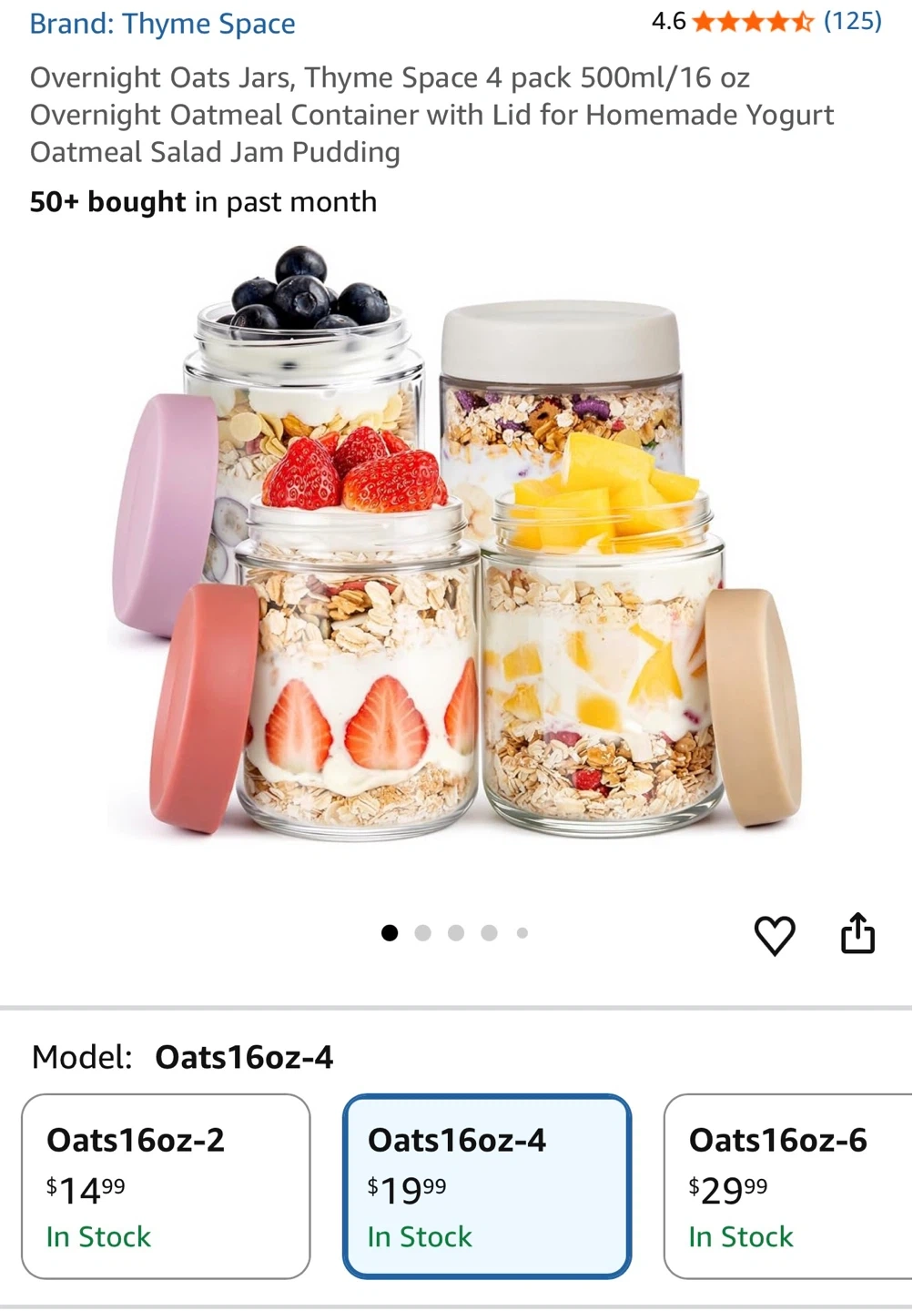 Set of four glass jars with colourful lids, perfect for overnight oats or storage. Each jar is 500ml/16 oz capacity and comes with a secure lid. These jars are great for packing lunches or storing small food items.