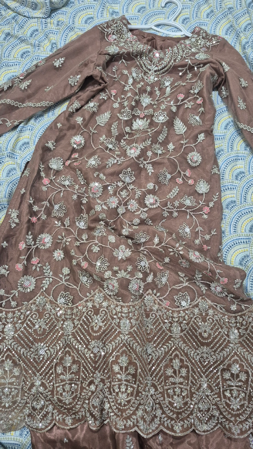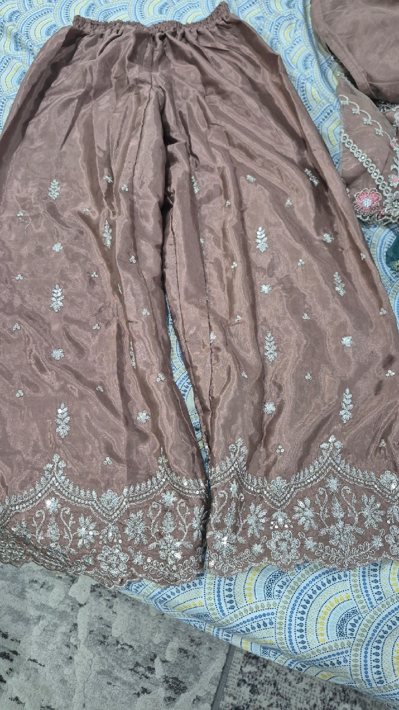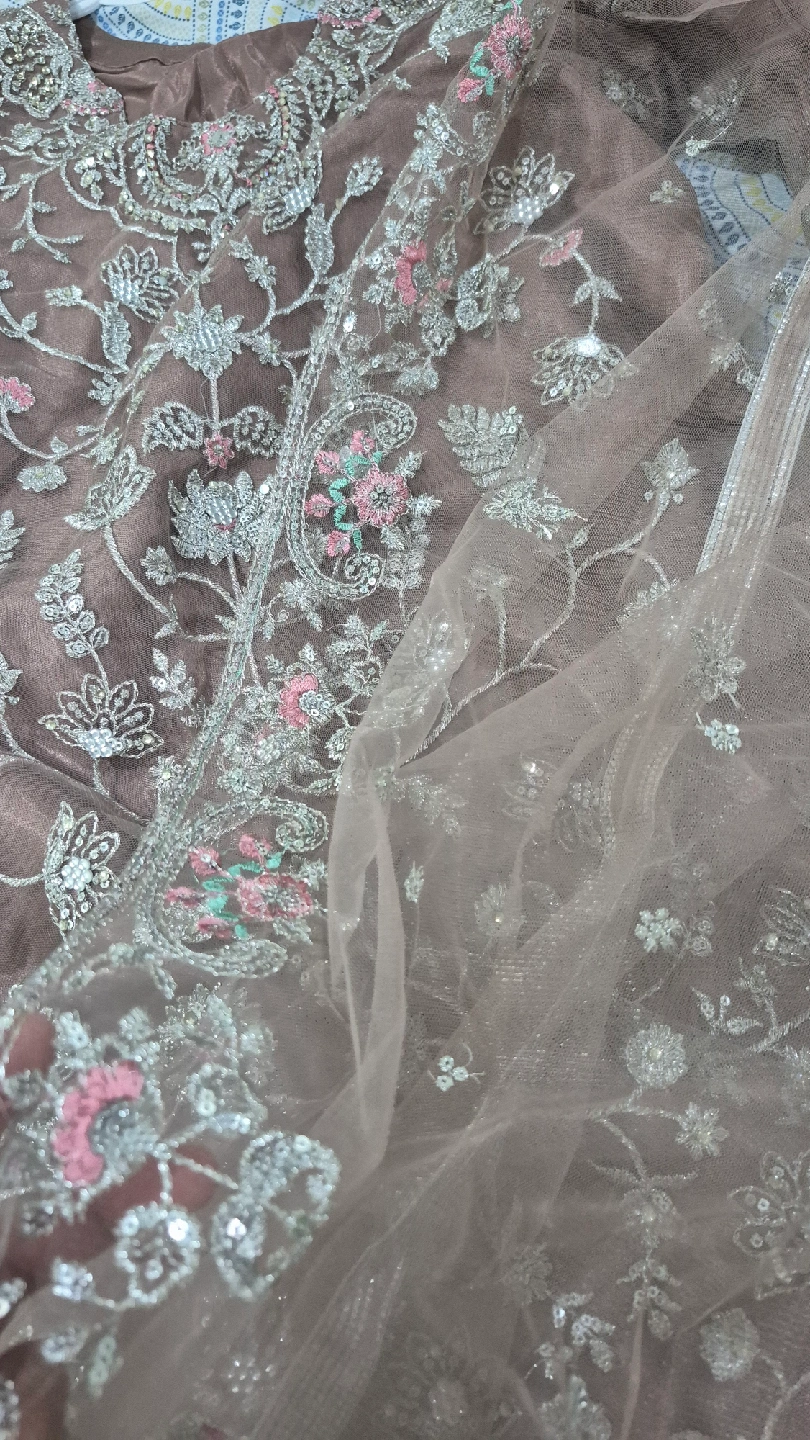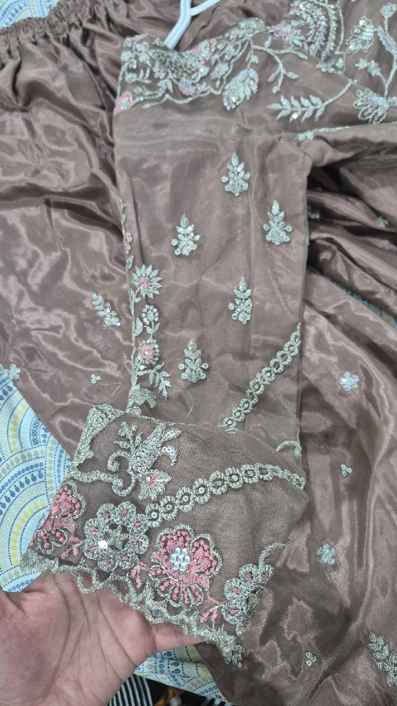 Selling a beautiful salwar kameez suit with intricate embroidery. The fabric has a lovely sheen and the embroidery features delicate floral patterns with pink and silver accents. Perfect for a special occasion!