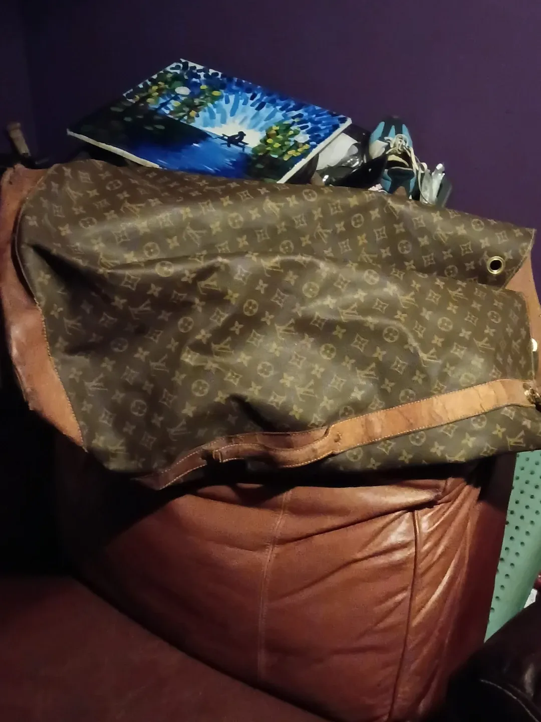 Classic Louis Vuitton monogram coated canvas travel bag. Features leather trim and handles. It's a spacious duffel, perfect for weekend getaways!