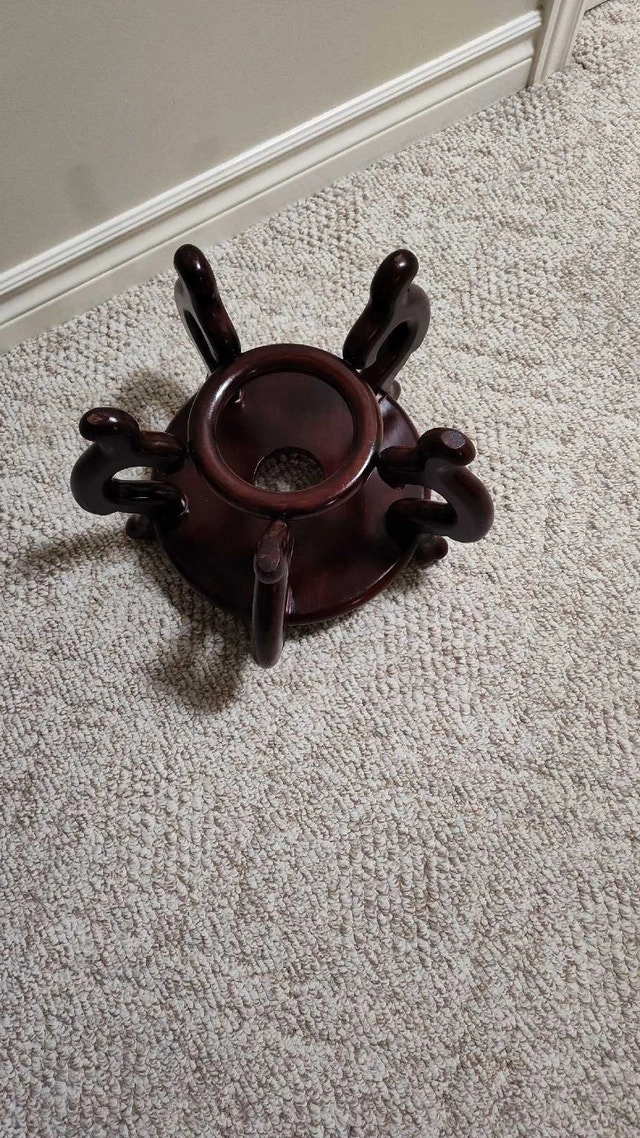 Add a touch of elegance to your home with this charming, used wooden plant stand, perfect for displaying your favourite potted plants! It features a decorative, dark wood finish and a sturdy, 5-legged design. Pick up in the Lisgar area of Mississauga. Round top, dark wood finish, 5-leg design. Condition: Used - Good. Cash accepted.