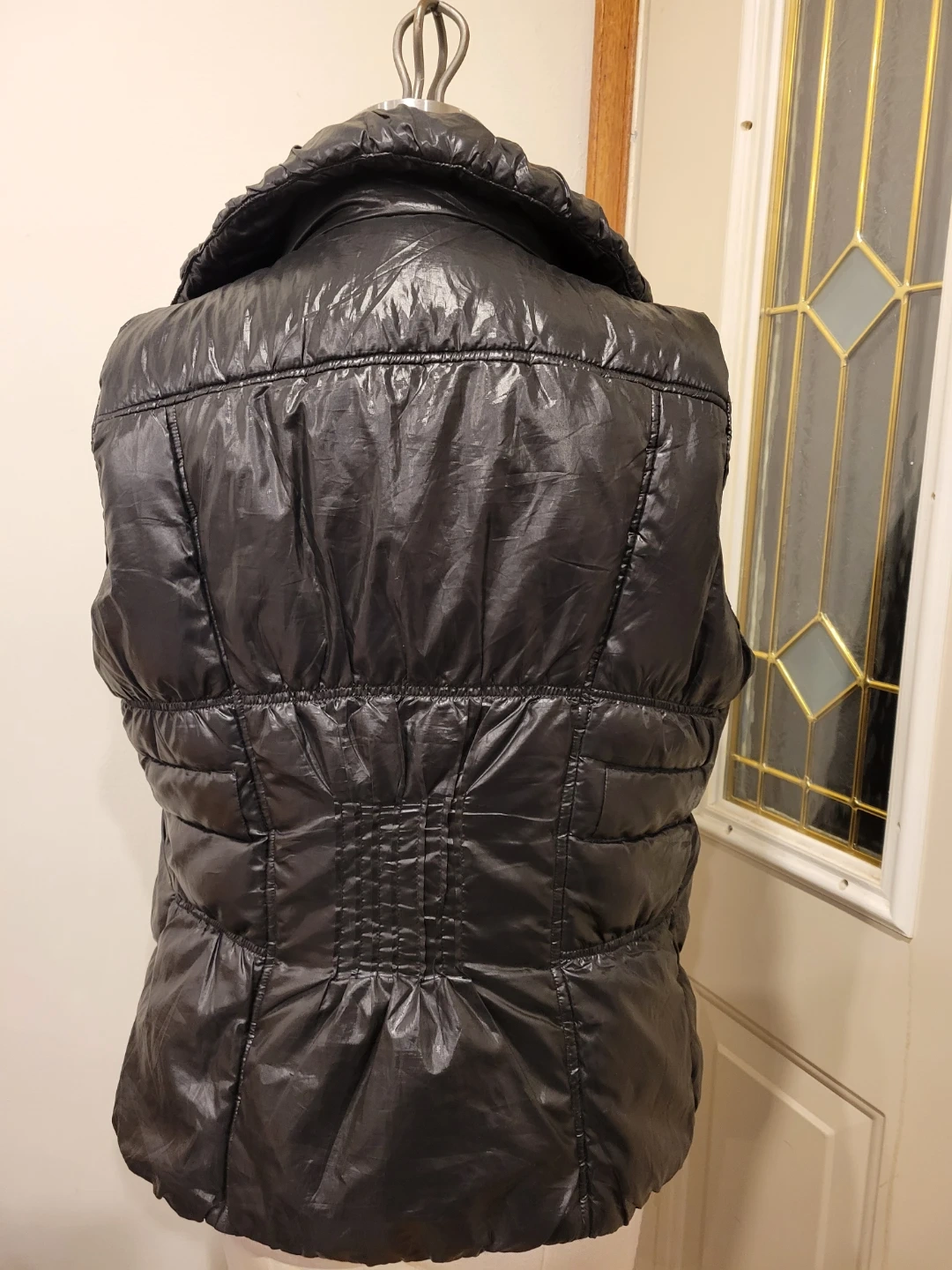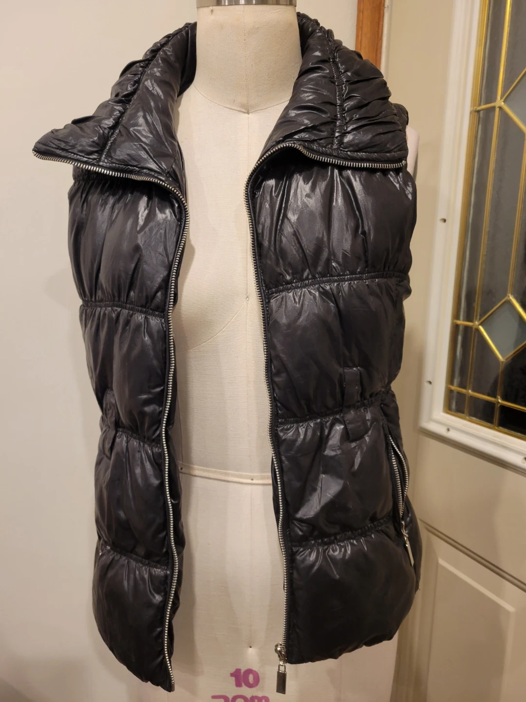 Sleek large black puffer vest with a shiny finish. Features a full zip front and a stylish ruched collar. Padded for warmth. Pickup location eglinton and dufferin area or yonge and bloor