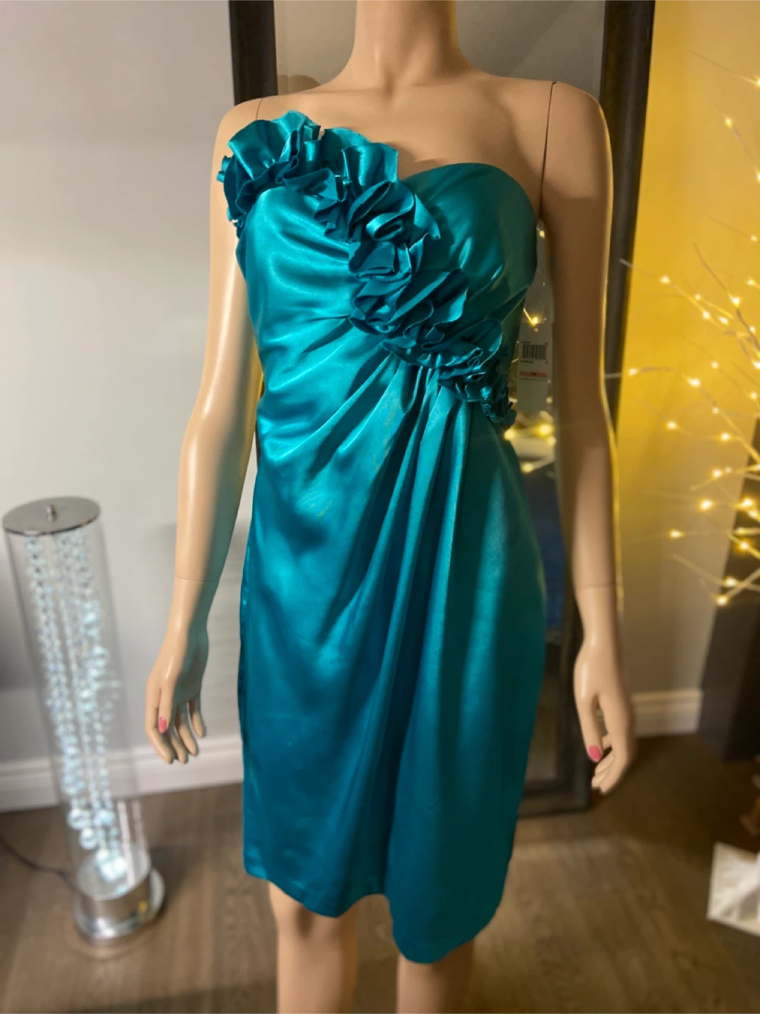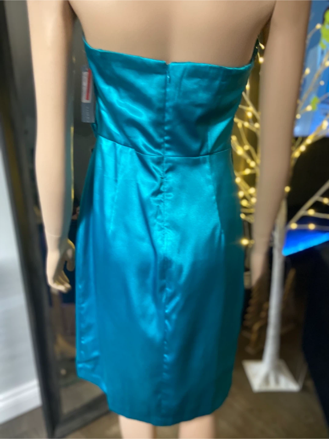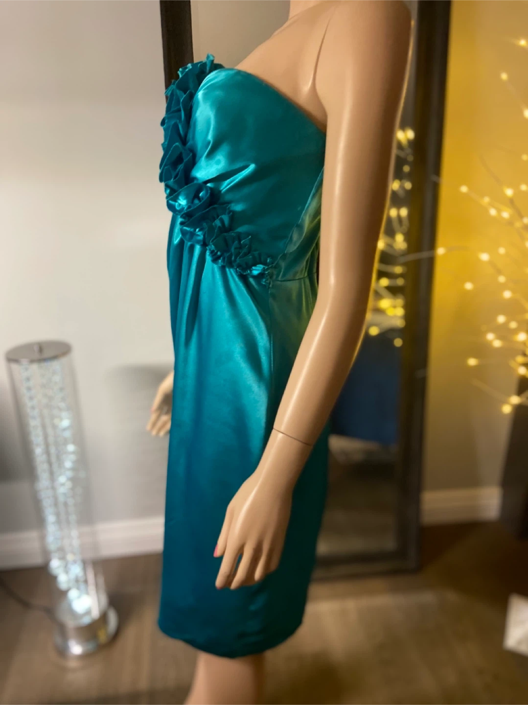 NWT: Teal Satin Strapless Ruched Floral Dress (Size 10) 109 502