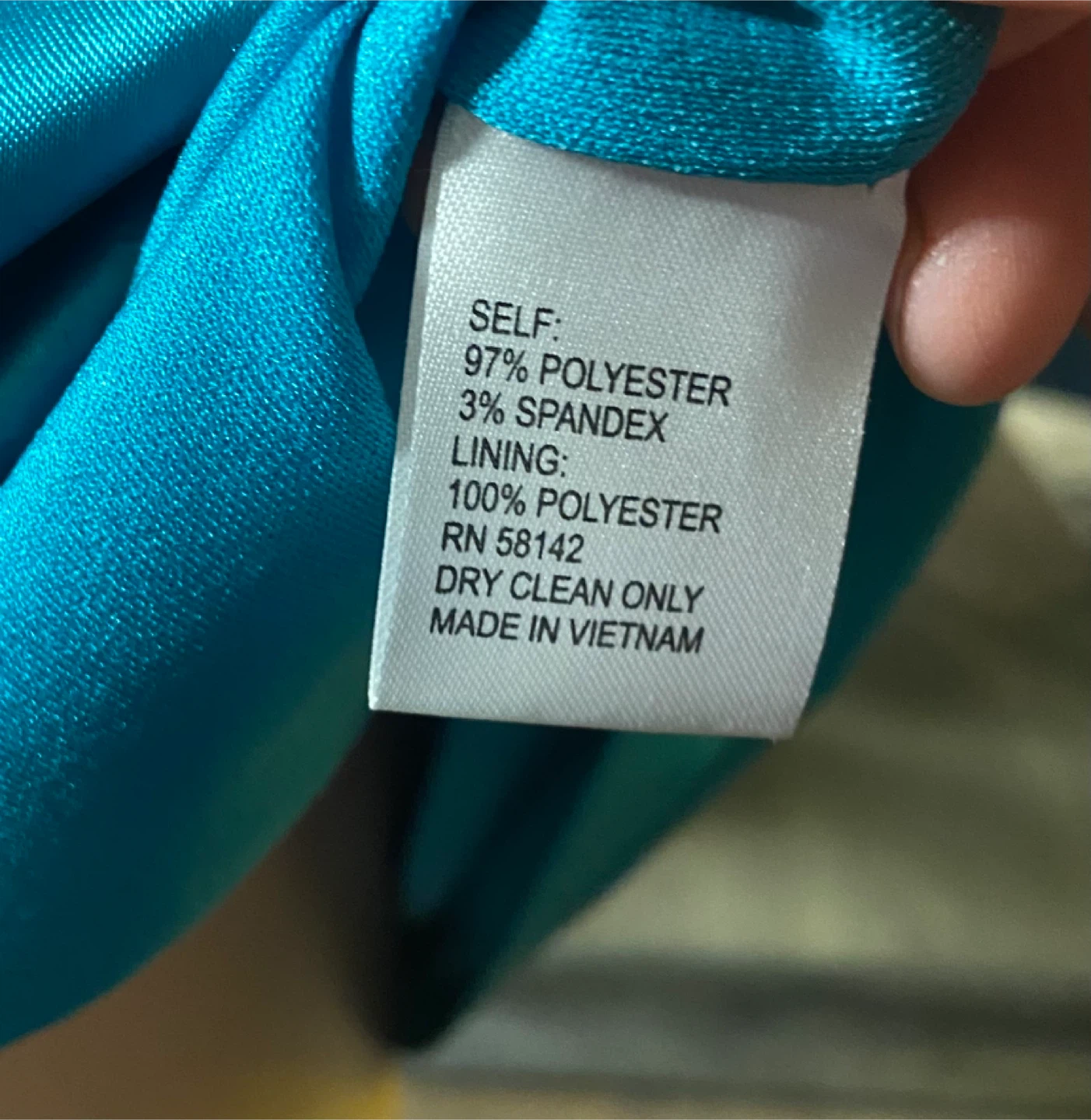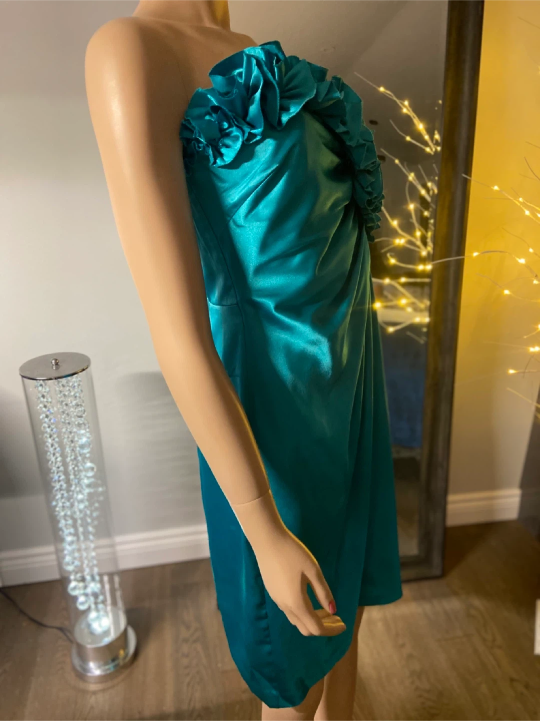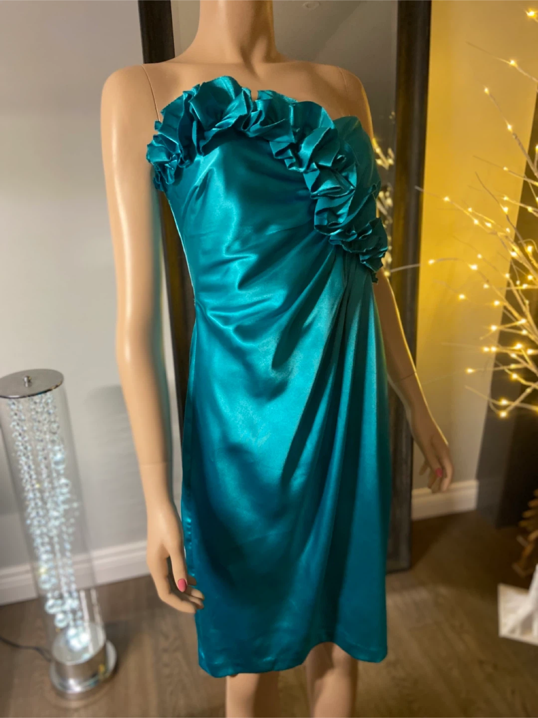 NWT: Teal Satin Strapless Ruched Floral Dress (Size 10) 109 502