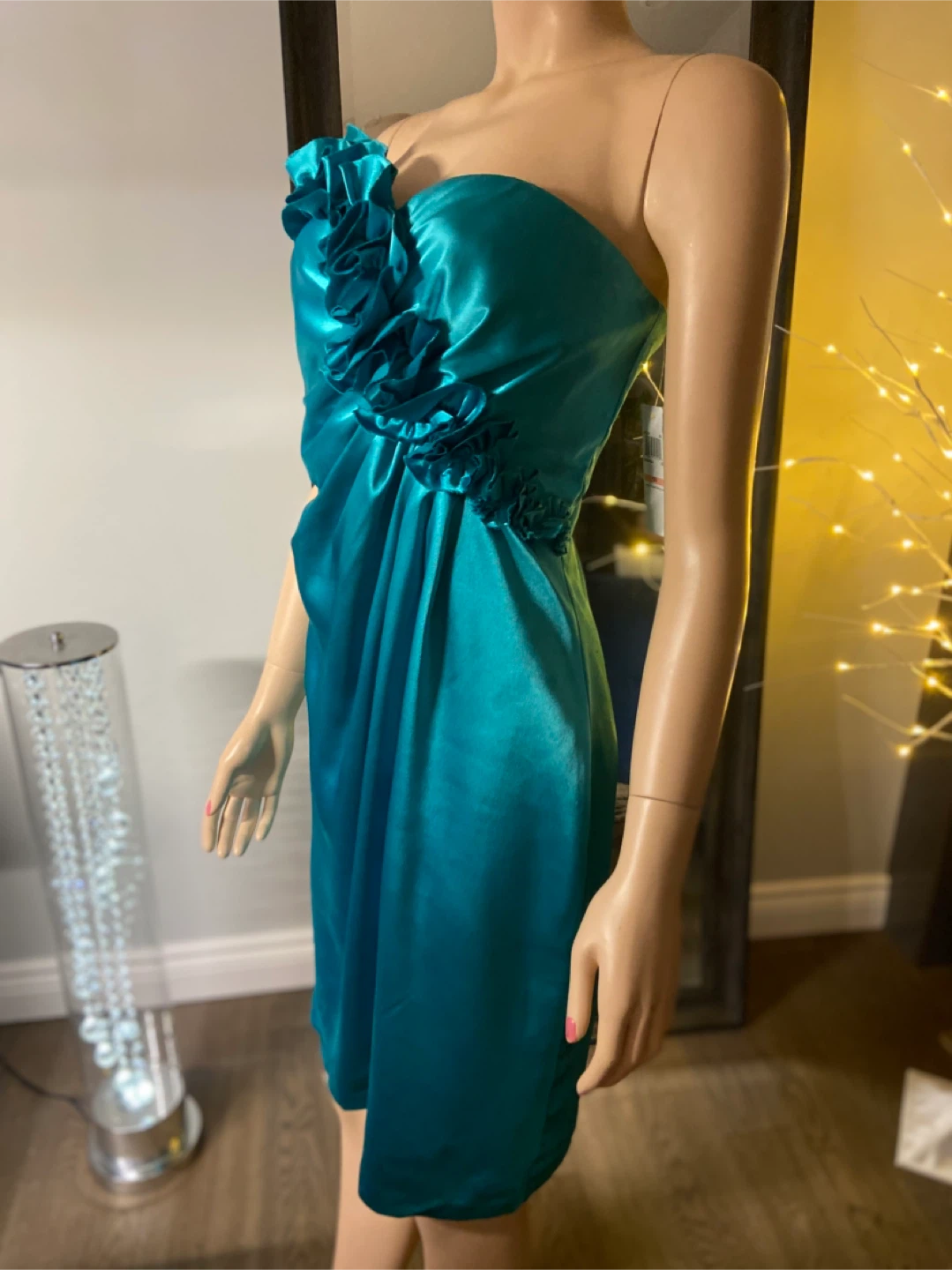 Strapless teal satin dress with flattering ruched bodice and beautiful floral accents. Perfect for a special occasion or a night out!