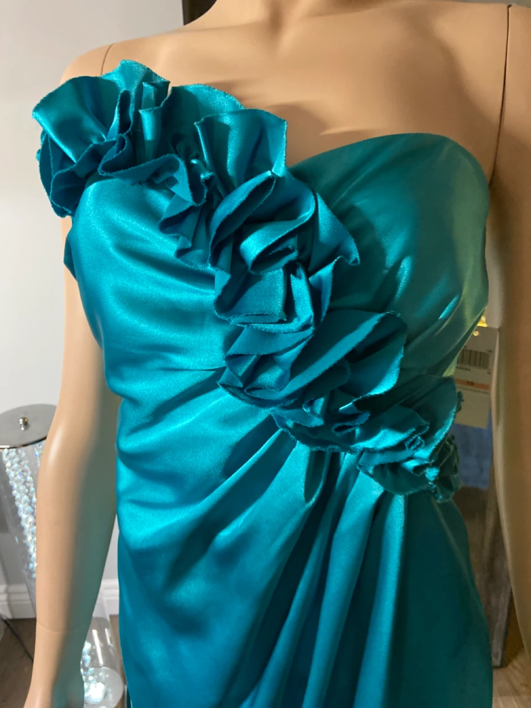 NWT: Teal Satin Strapless Ruched Floral Dress Size 10