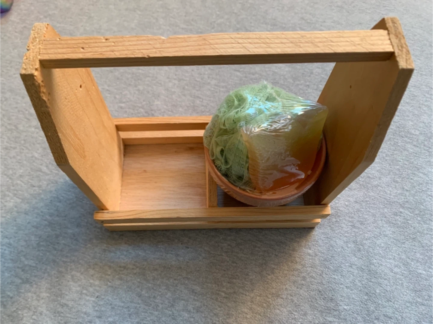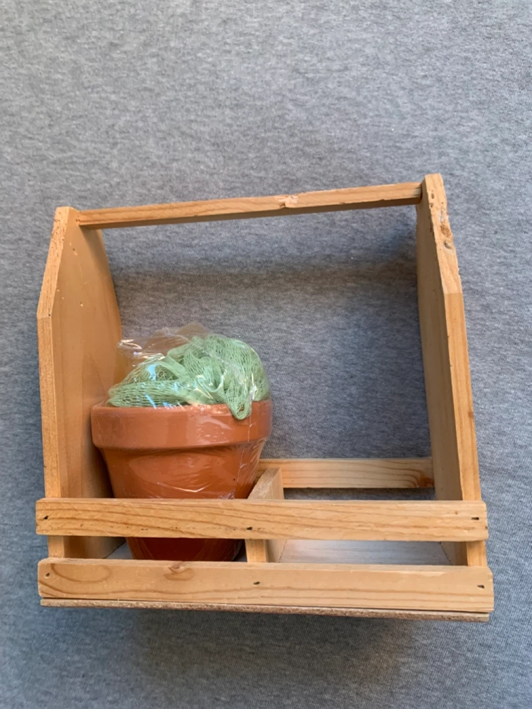 Includes a terracotta-coloured planter and a green bath sponge with soap in cellophane . Made from light-coloured wood, it features a handle for easy carrying.