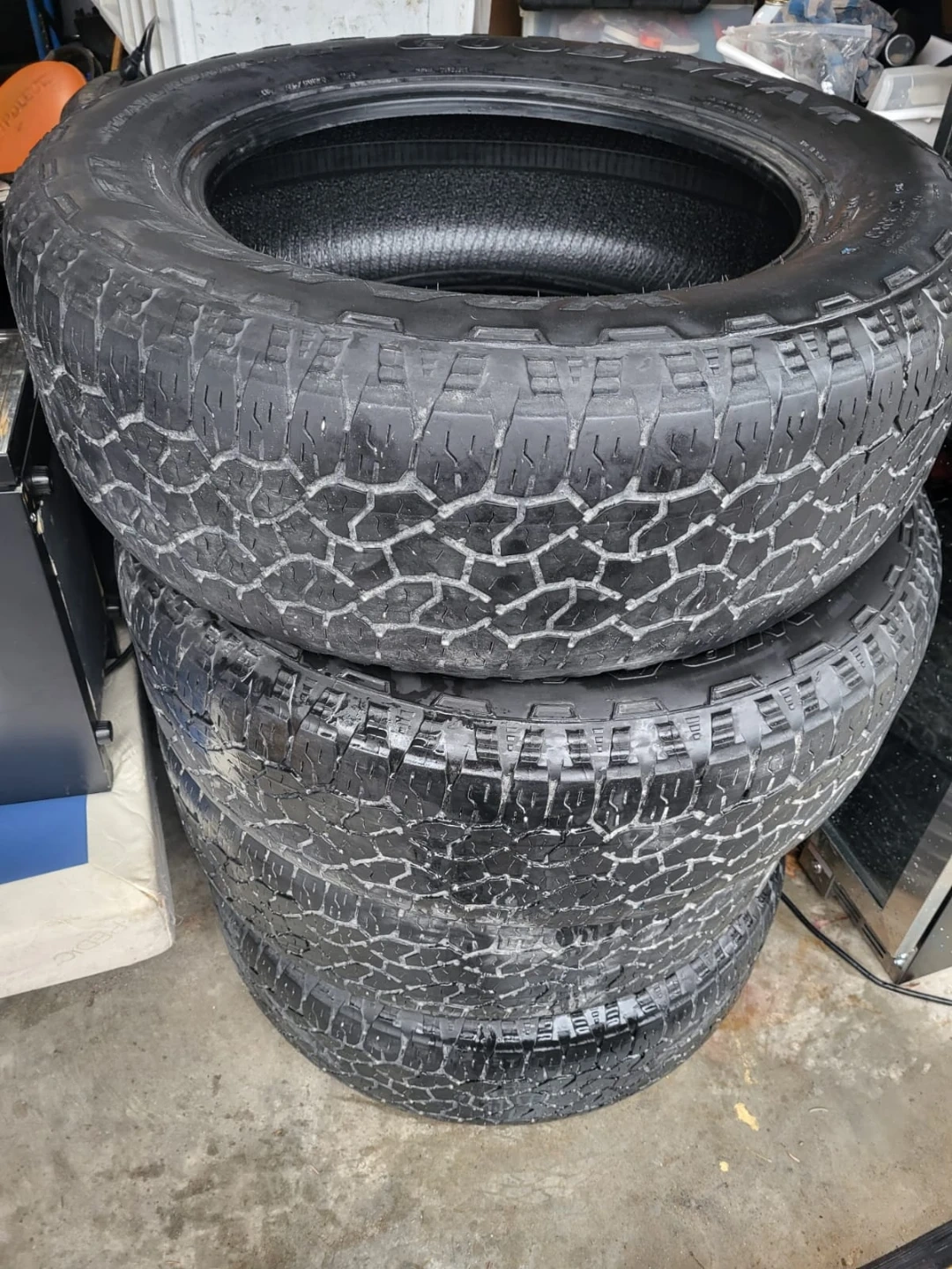 Set of four Goodyear Wrangler Duratrac tires. Size LT275/60R20. Manufactured in 2023. These are all-terrain tires built for off-road capability.