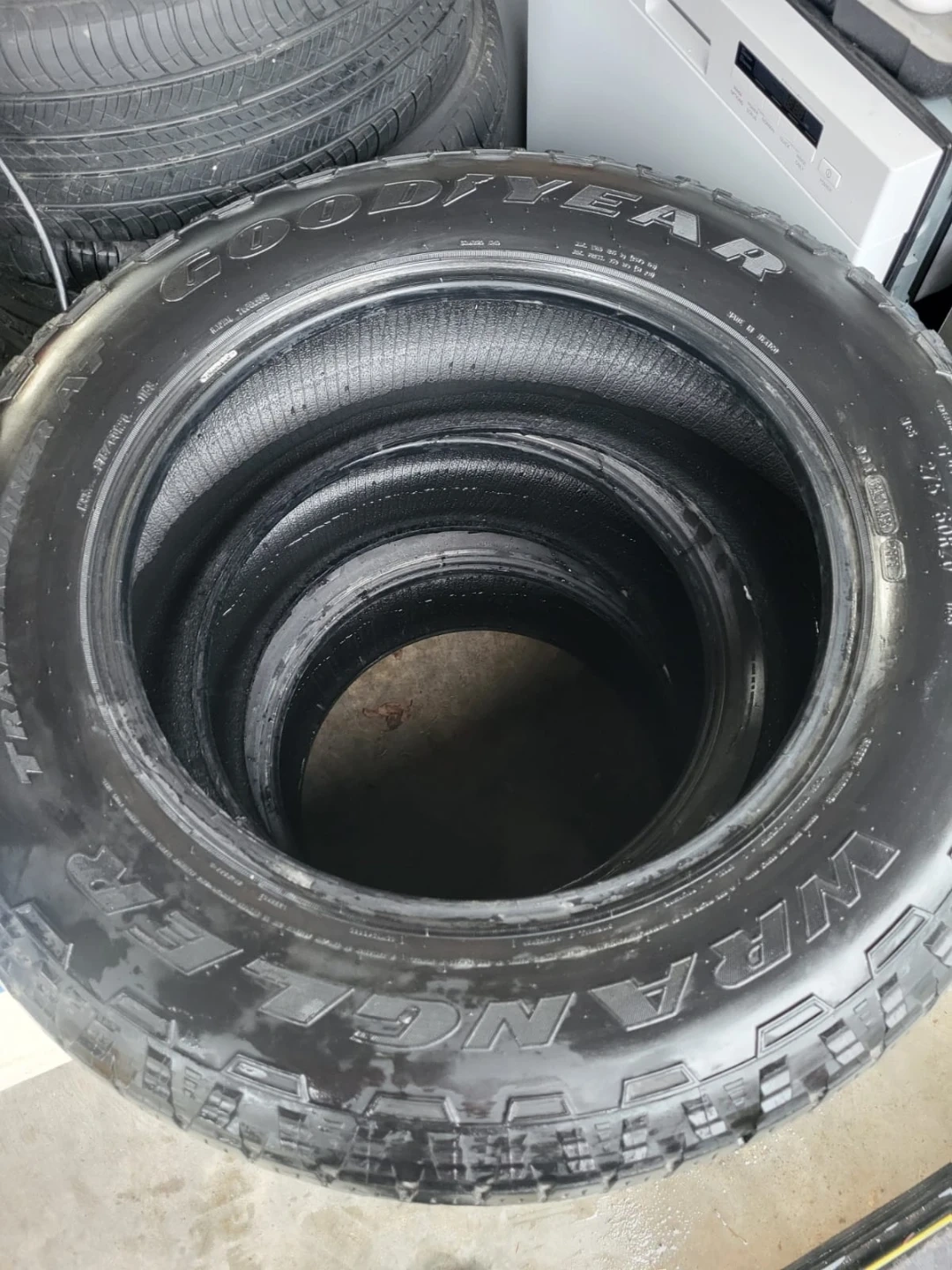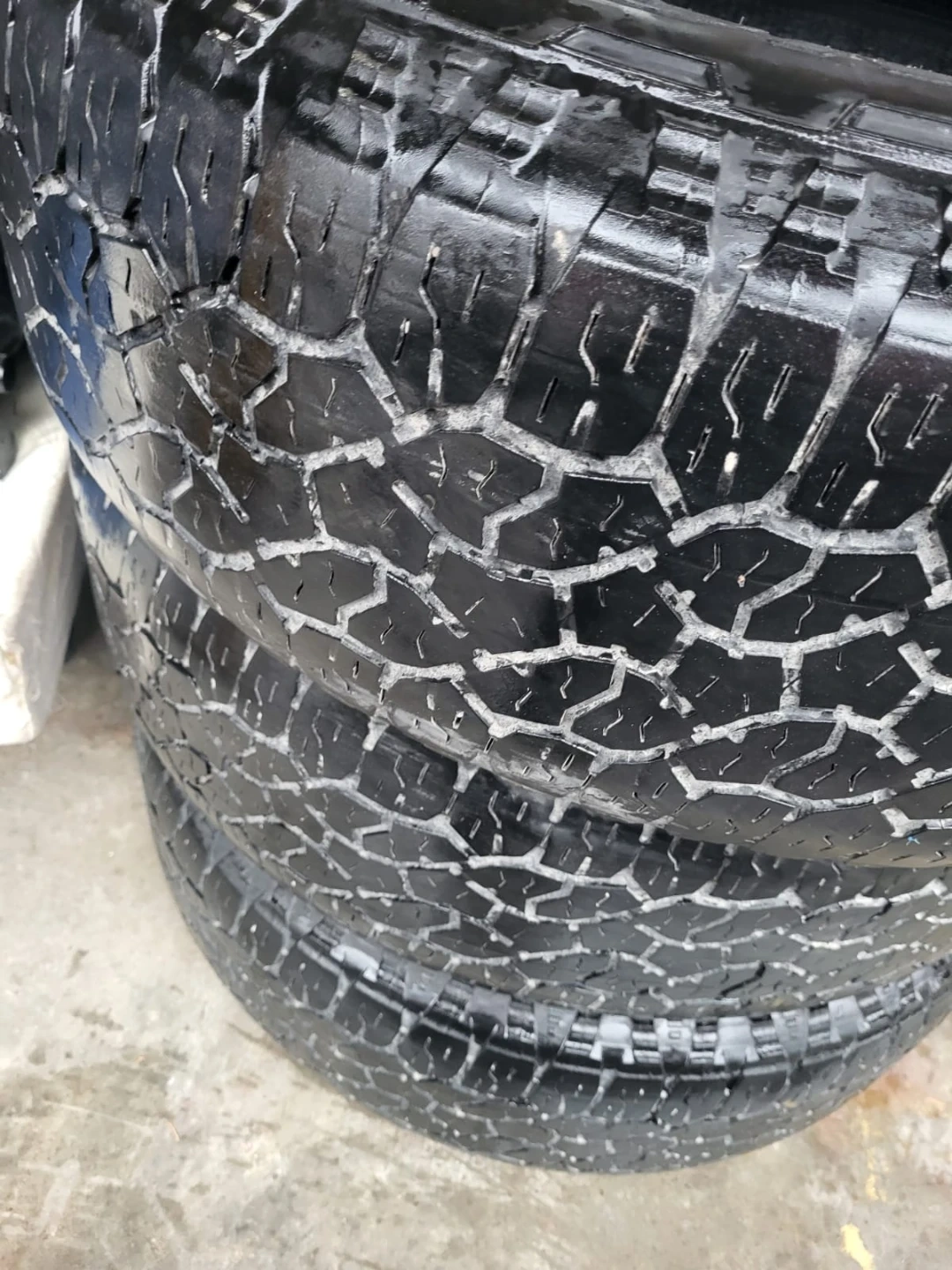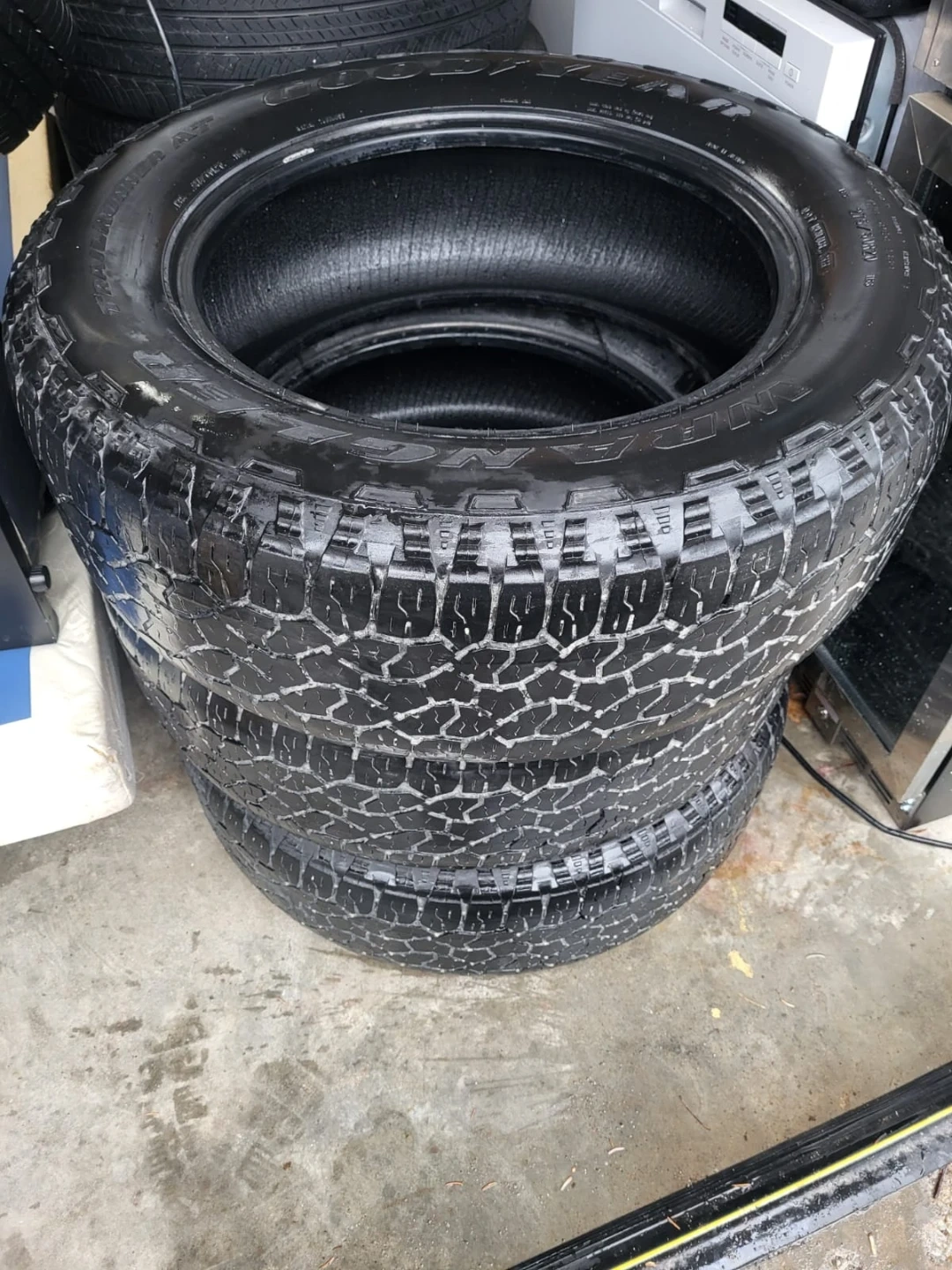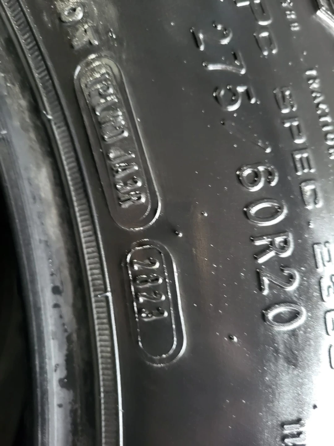 Set of four Goodyear Wrangler Duratrac tires. Size LT275/60R20. Manufactured in 2023. These are all-terrain tires built for off-road capability.