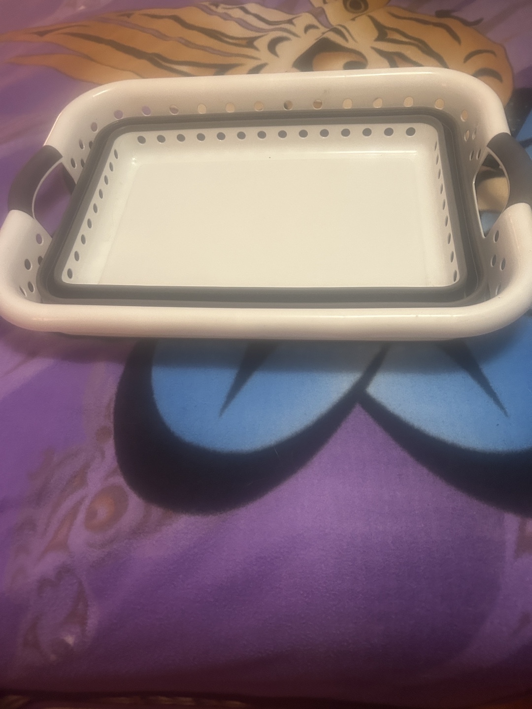 White and grey plastic laundry basket. Collapsible design for easy storage. Two handles for carrying. Great for laundry, storage, or organizing.