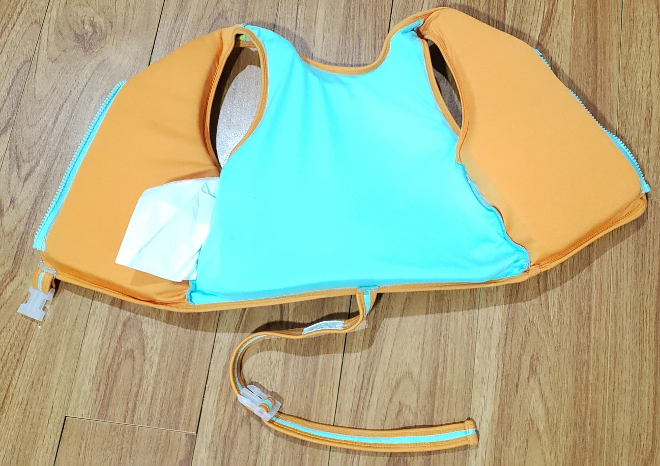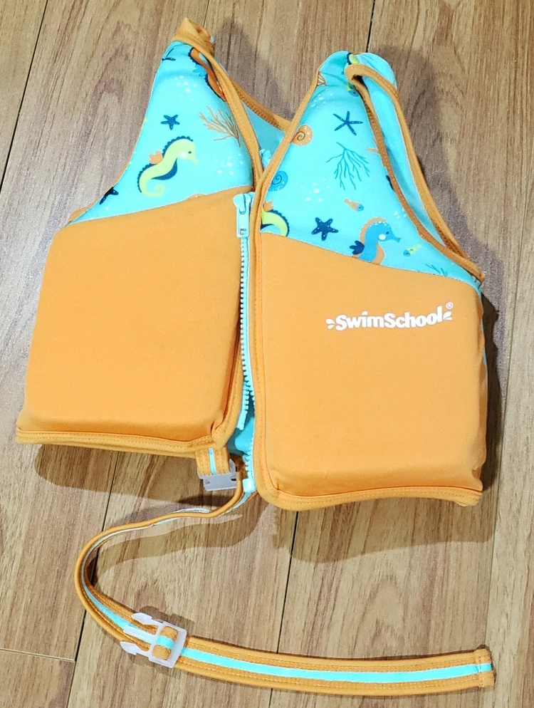 A swim vest for your child. Features an orange and blue colour scheme. Includes a zipper and buckle. Perfect for enjoying the water in a safe and comfortable way.