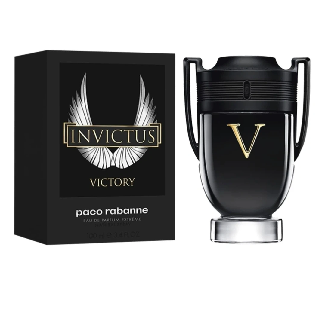 This is Paco Rabanne Invictus Victory Eau de Parfum Extreme for men. It's a 100ml natural spray. The bottle has a distinctive trophy design and comes in its original packaging.