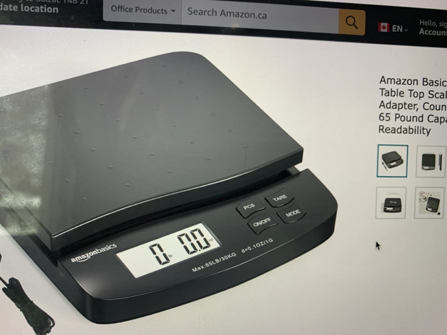 This Amazon Basics table top scale has a 65 lb capacity. It includes an adapter and offers 0.1 oz readability. The scale has modes for PCS, Tare, On/Off, and Mode functions.