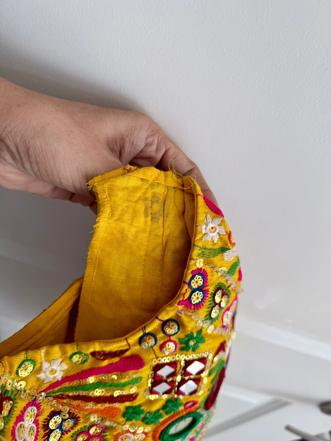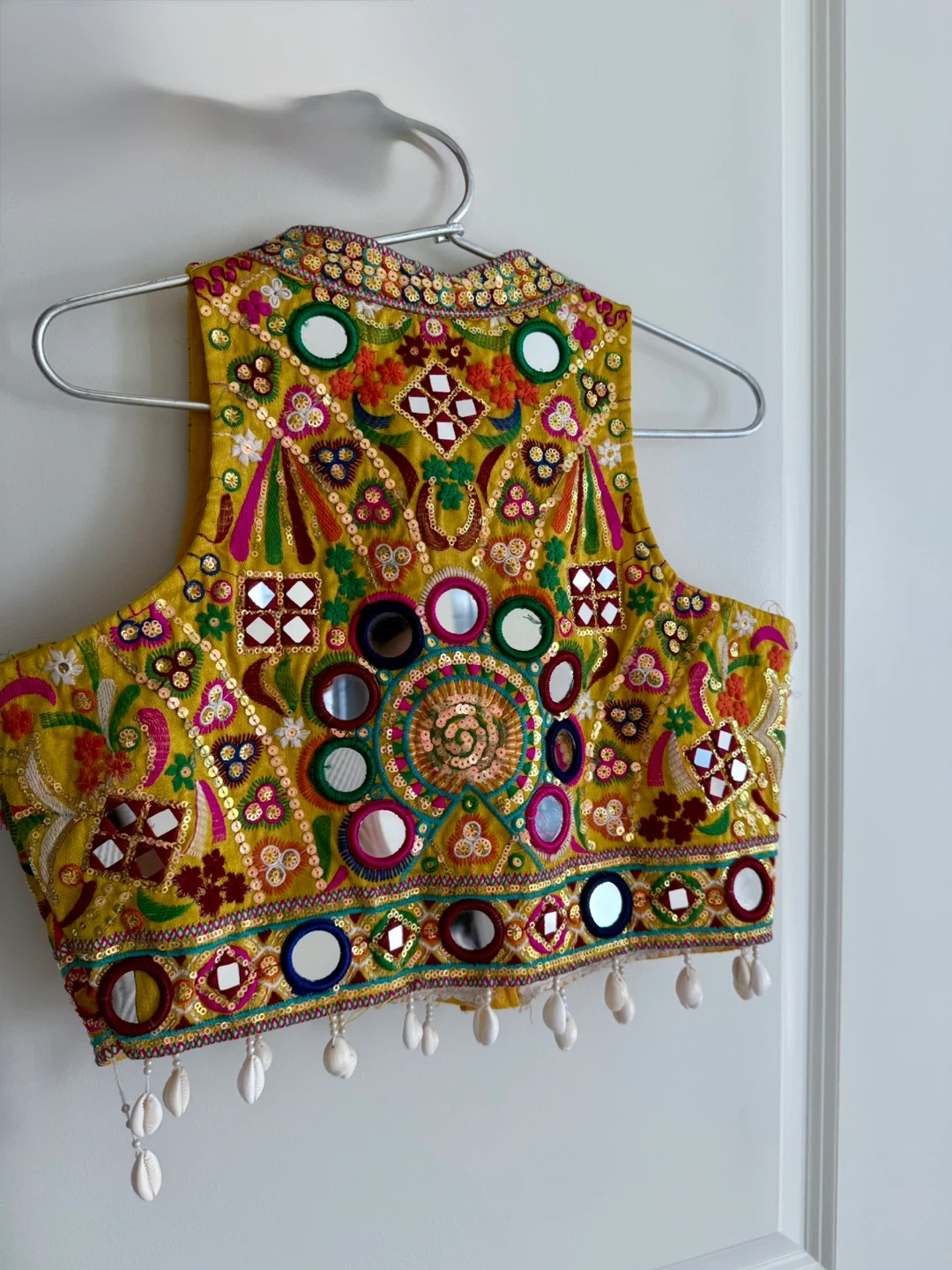 Bright yellow sleeveless vest adorned with intricate embroidery, colourful beads, sequins, and small mirrors. It also features decorative white shells along the hemline. This unique piece is perfect for adding a pop of style to any outfit!