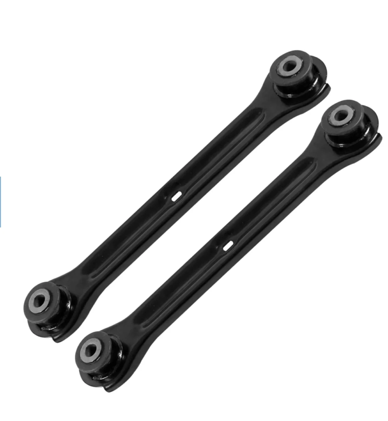 This listing is for a set of two black control arms. They appear to be made of metal with rubber bushings. These are replacement parts for automotive suspension systems.