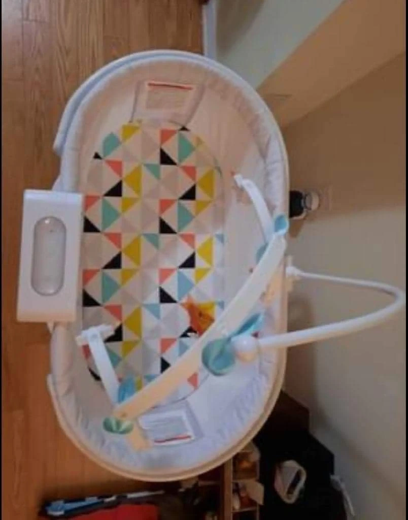 Calming sway motion generated by you or baby, dual light mode, light projection unit is removable. Also has a vibrator and plays soothing music and sounds. Flat sleeping surface.