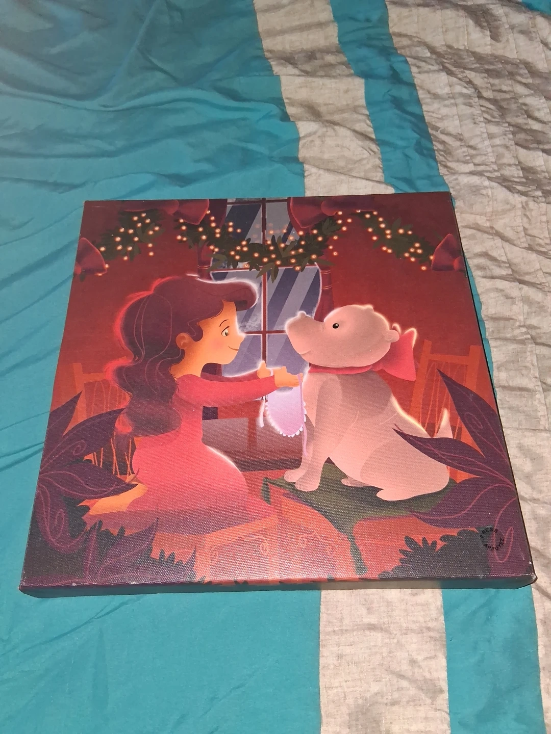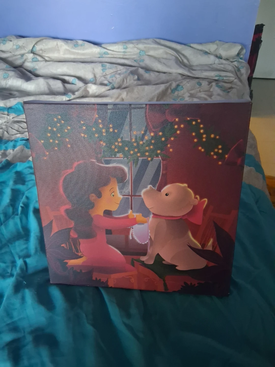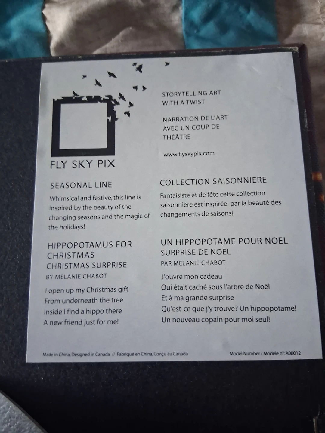 This Fly Sky Pix art piece is from their seasonal line, inspired by the holidays. The art is titled "Hippopotamus for Christmas" and is by Melanie Chabot. It depicts a girl opening a gift with a hippopotamus. It's designed in Canada. Can be put on the wall or use the pop out stand to stand on desk, dresser, table, etc. Takes 2 button batteries as the art sings "All I want for Christmas is a hippocampus" by pushing the button on the bottom right corner.
