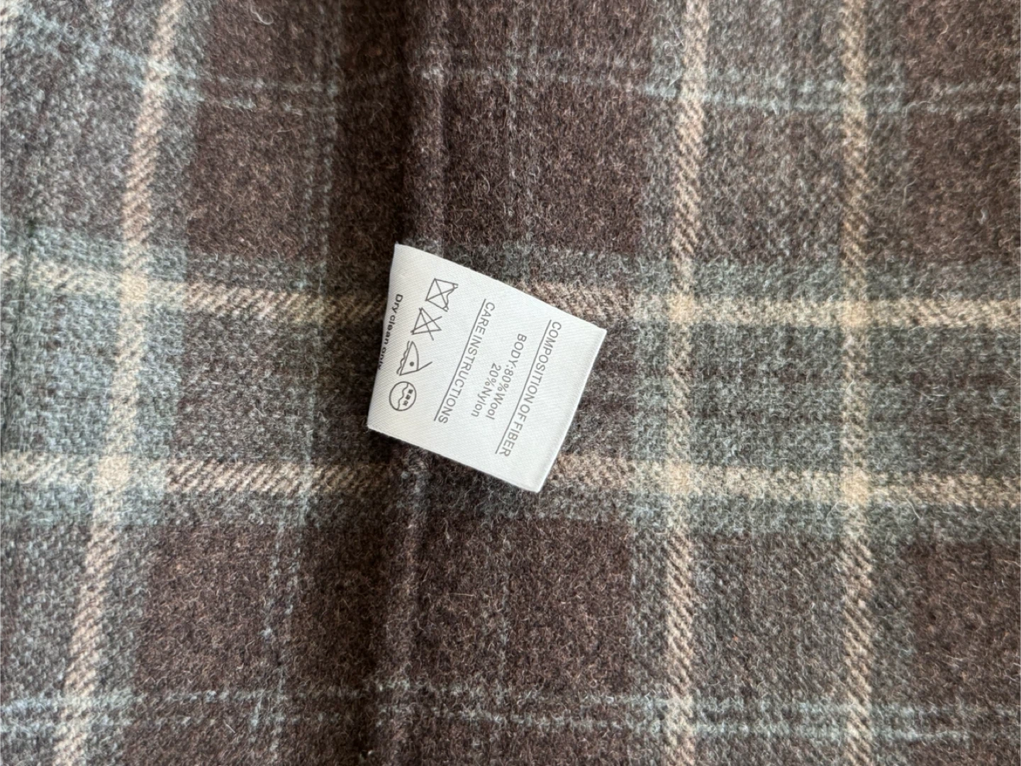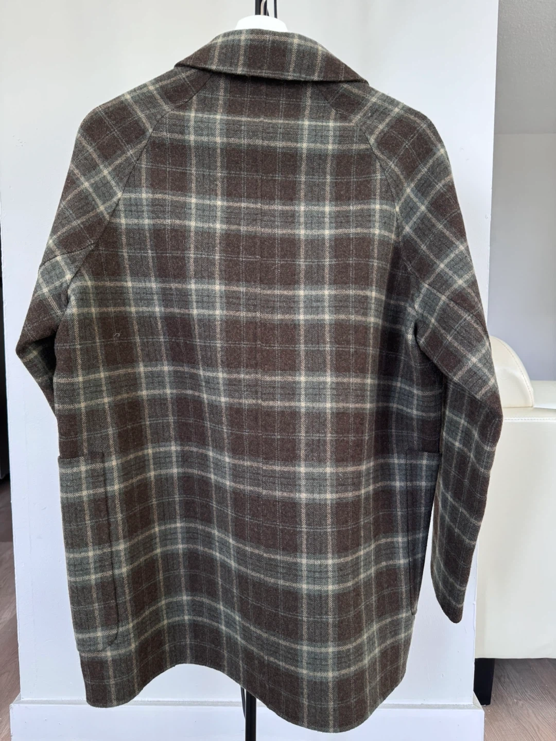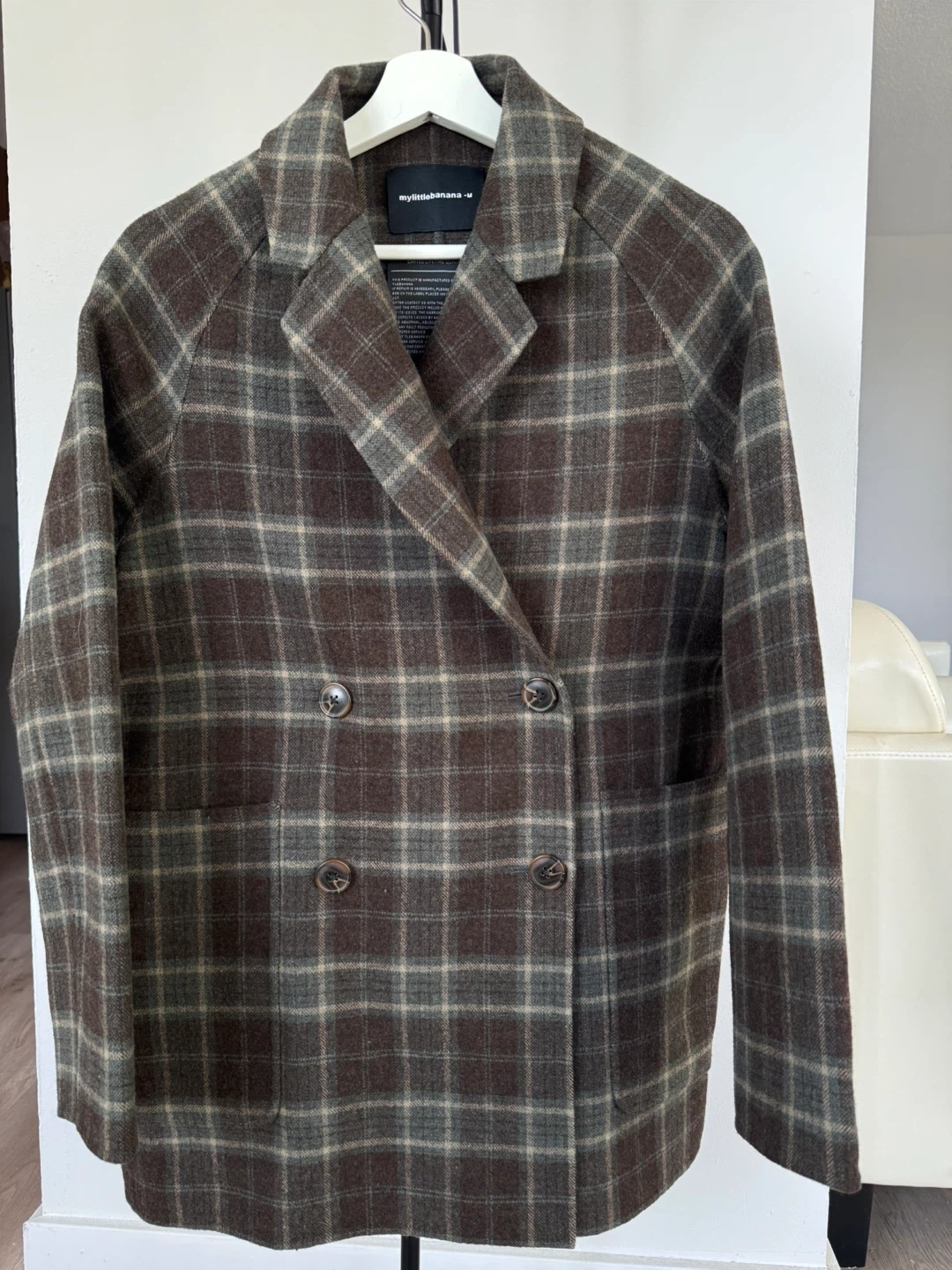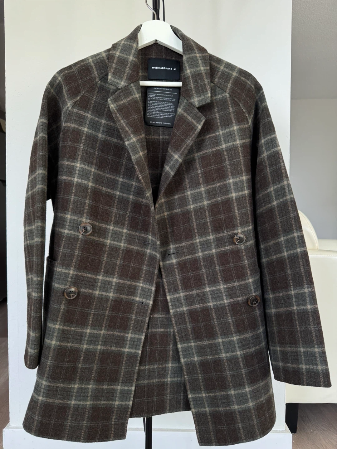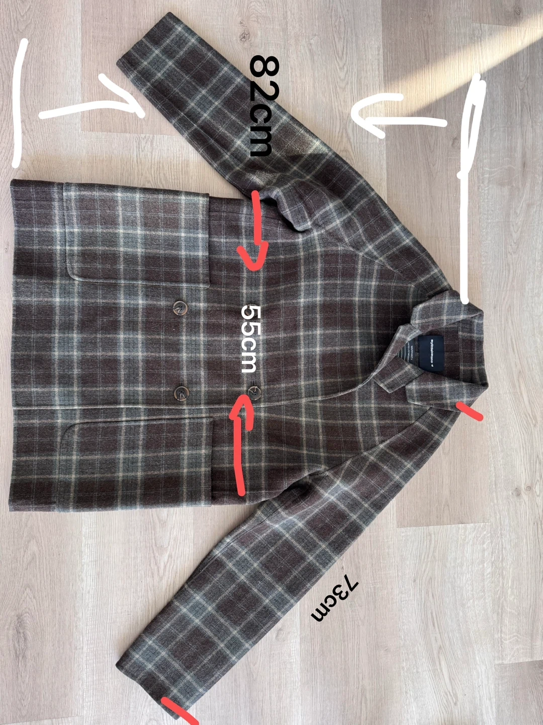 It's a double-breasted style with pockets. Measurements: 82cm in length, 55cm across the chest, and 73cm for the sleeve length