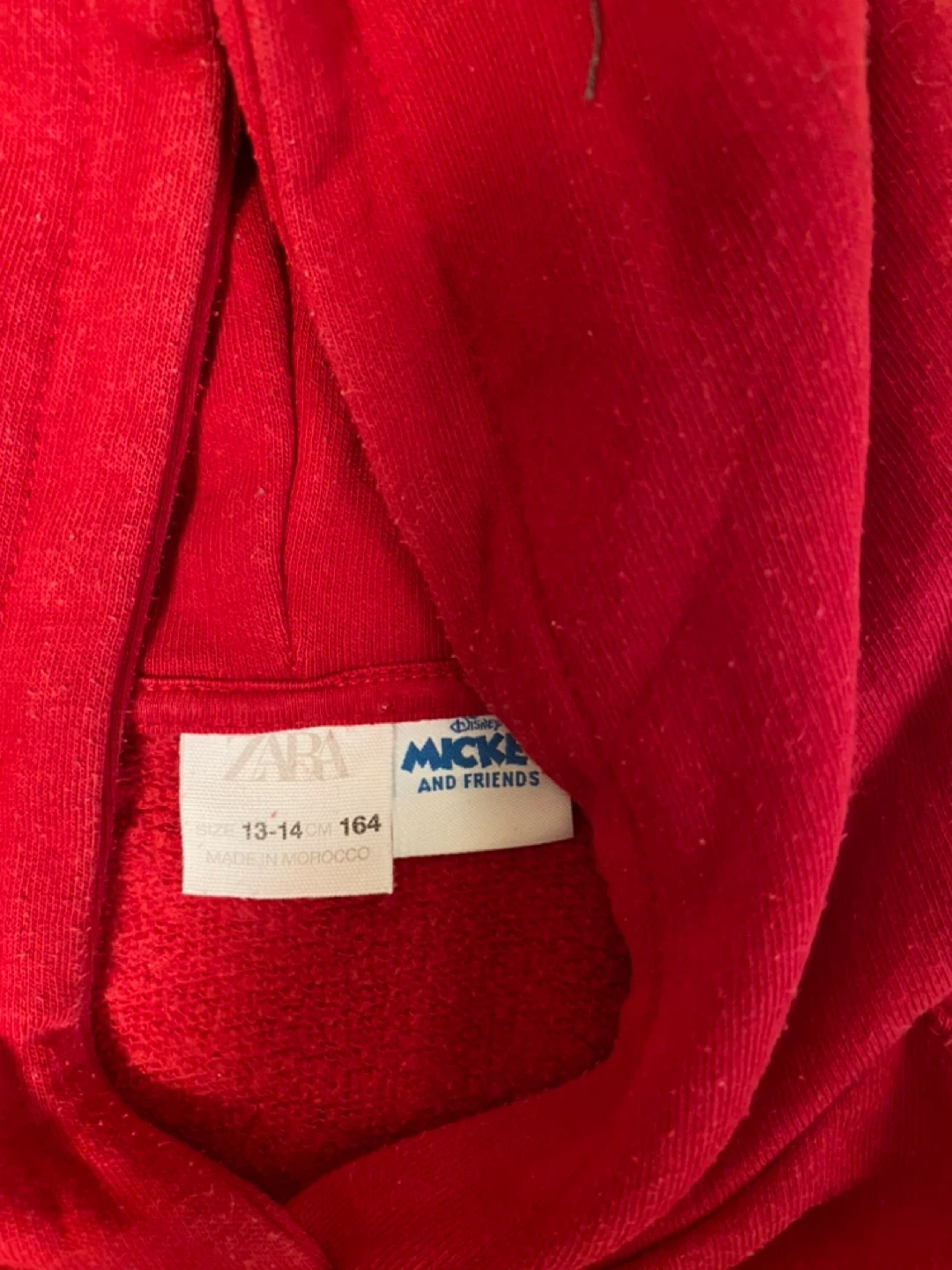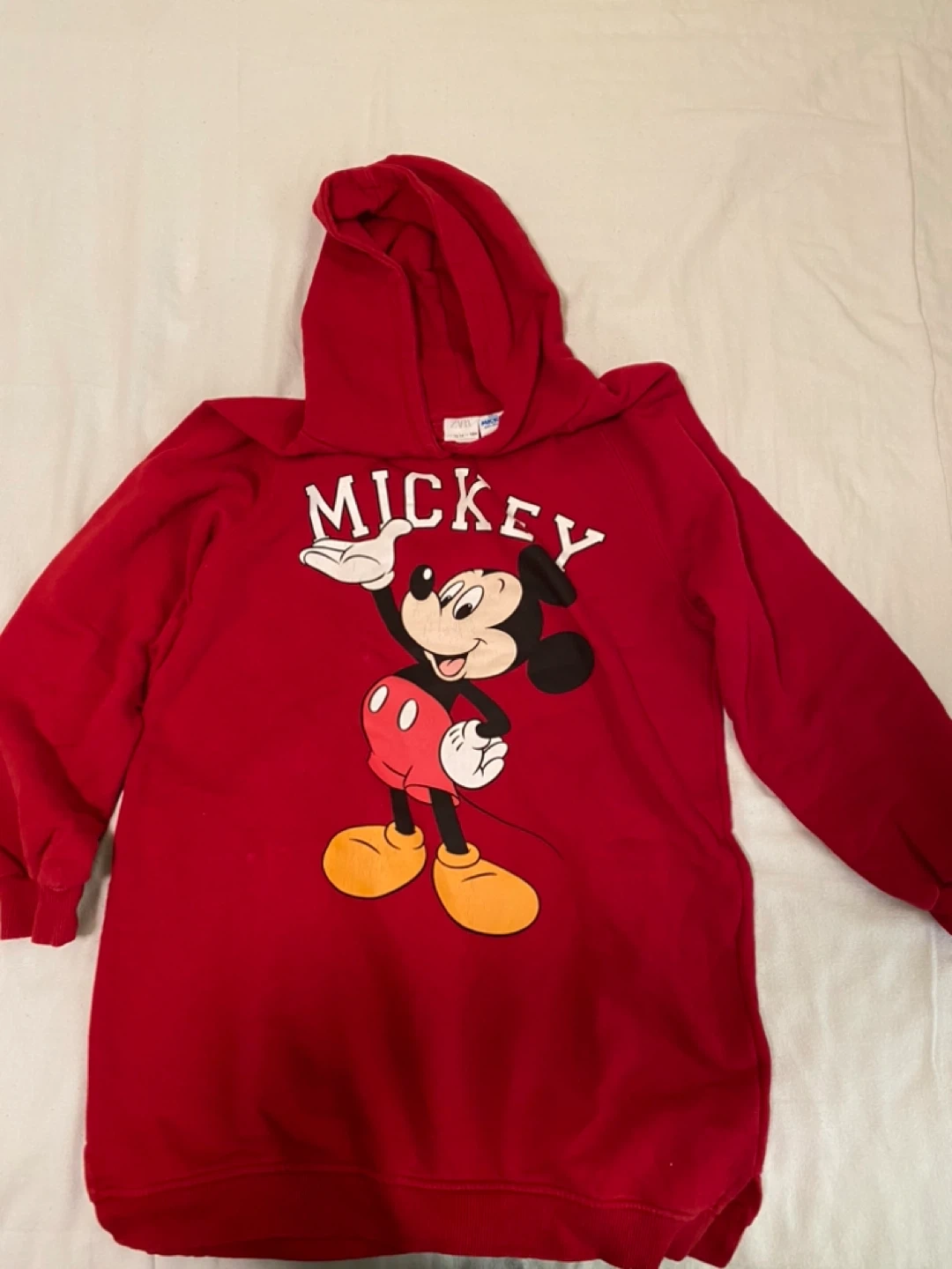 Selling a Zara Disney Mickey and Friends hoodie in red! It's a size 13-14, which is equivalent to 164 cm. It’s a long dress style(middle of hip and knee)