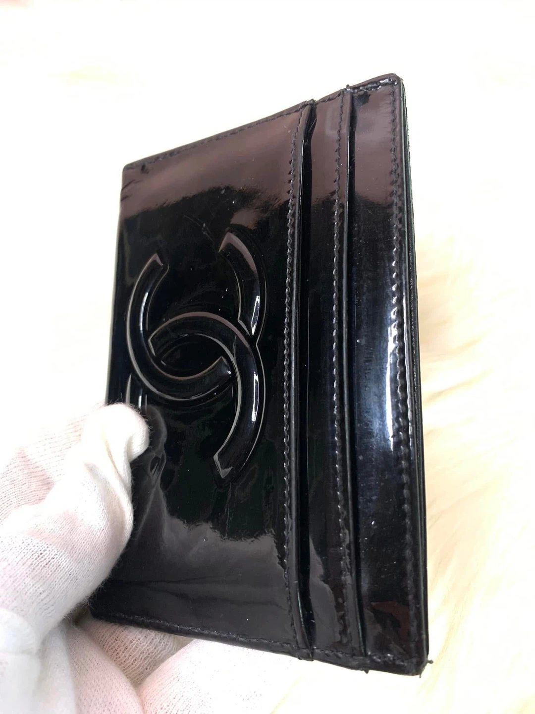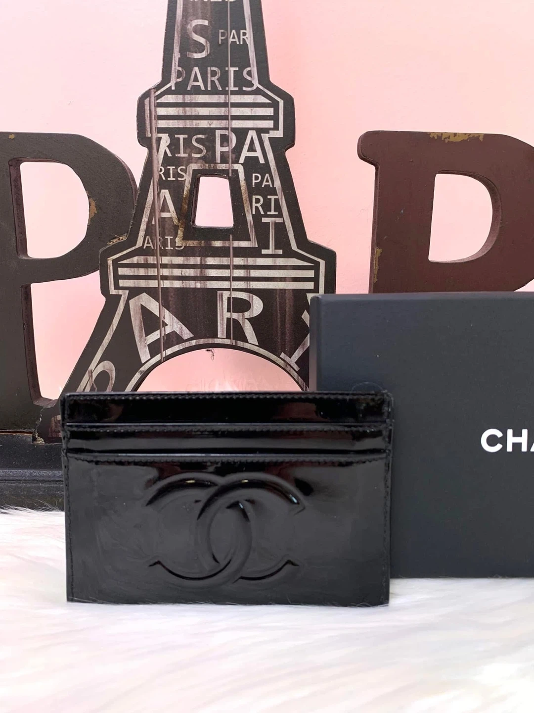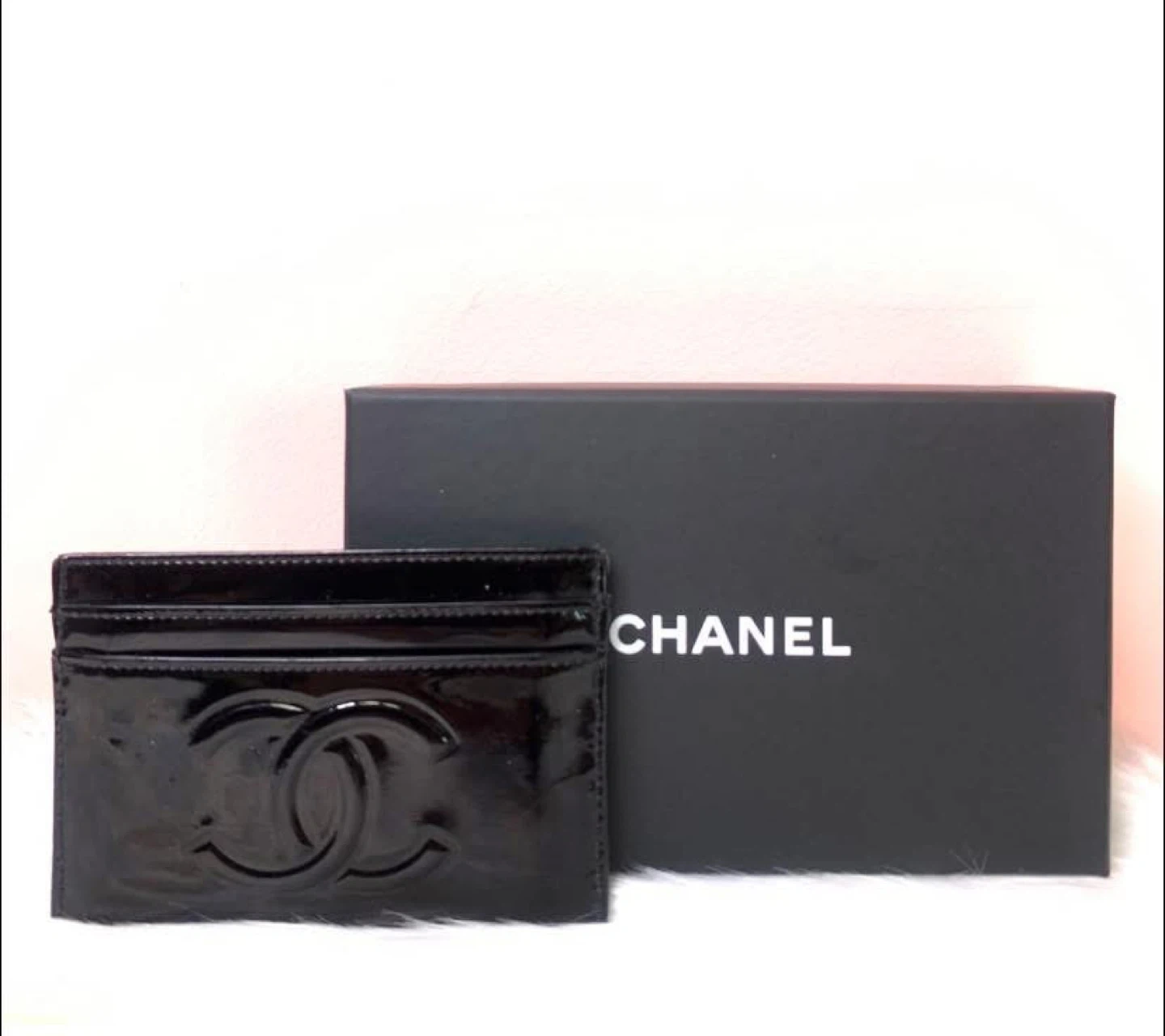 This is a chic CHANEL card holder in glossy black patent leather. It features the iconic CC logo embossed on the front. The interior has multiple card slots for organization. Includes the original CHANEL box!