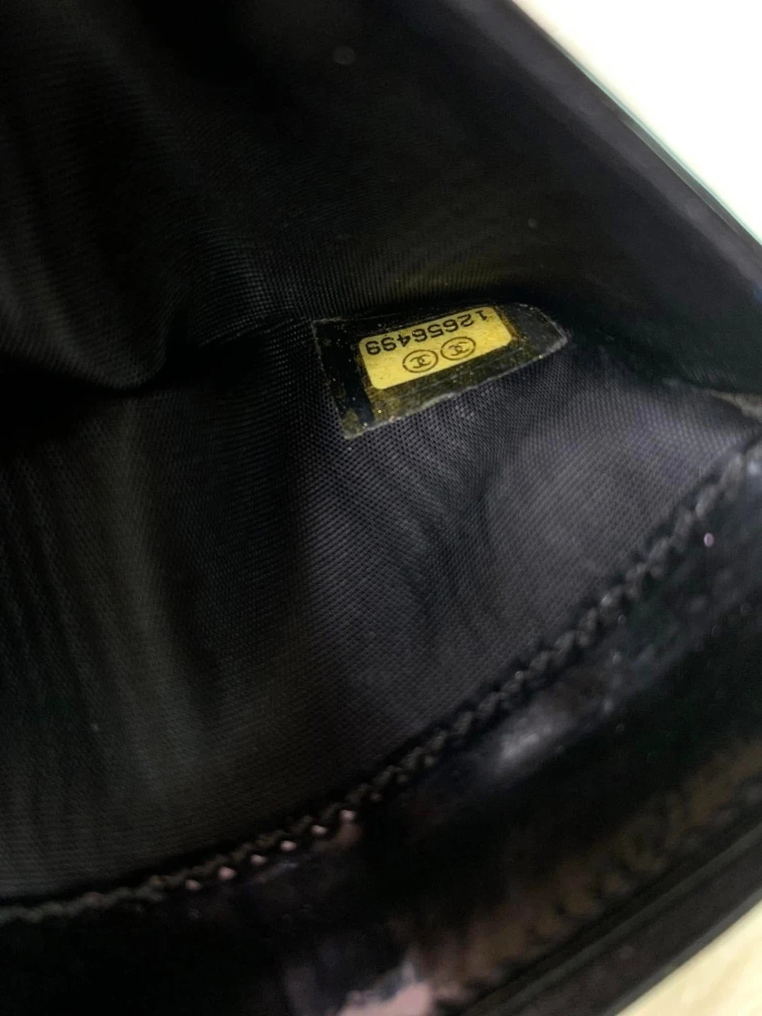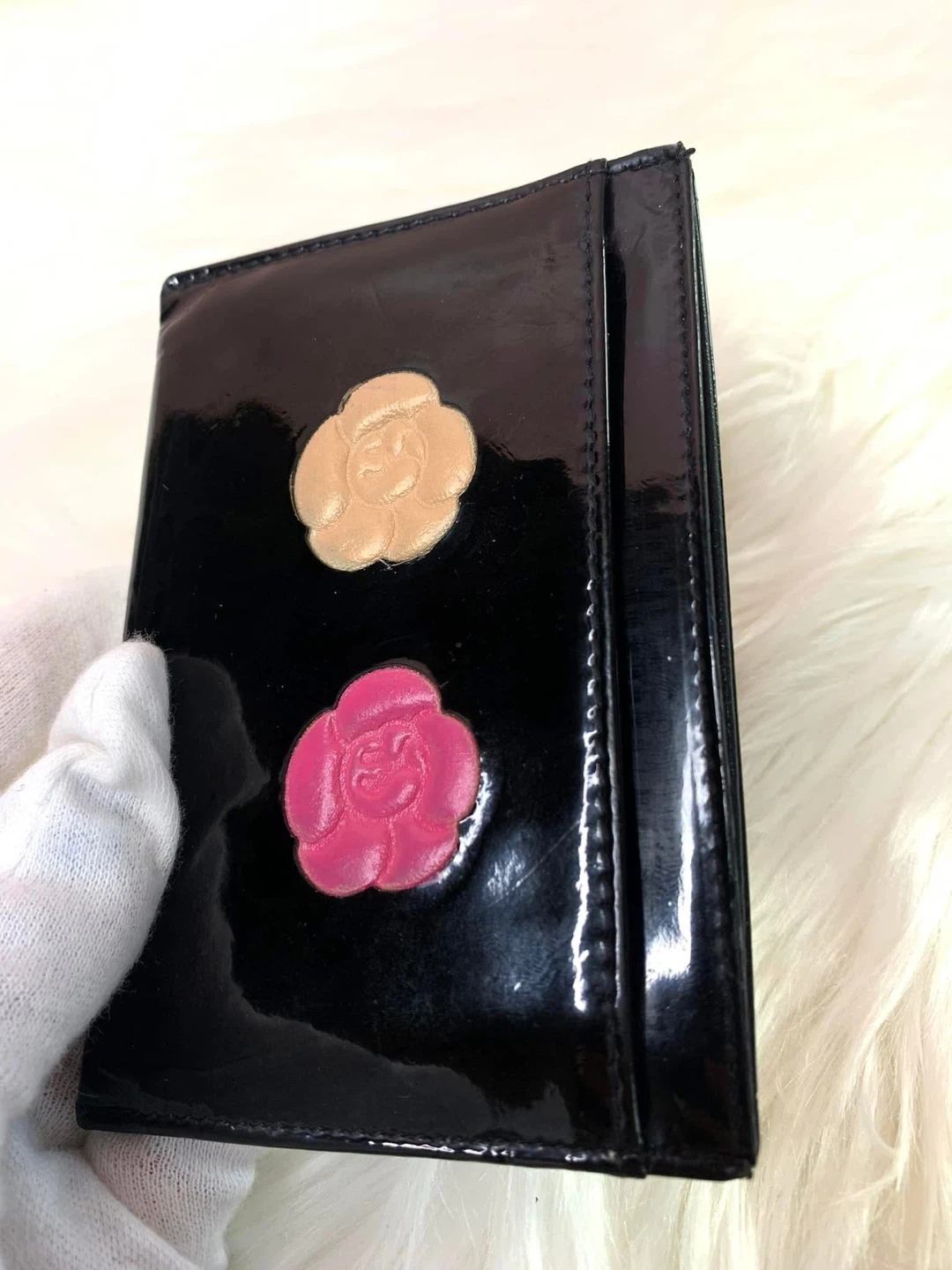 This is a chic CHANEL card holder in glossy black patent leather. It features the iconic CC logo embossed on the front. The interior has multiple card slots for organization. Includes the original CHANEL box!