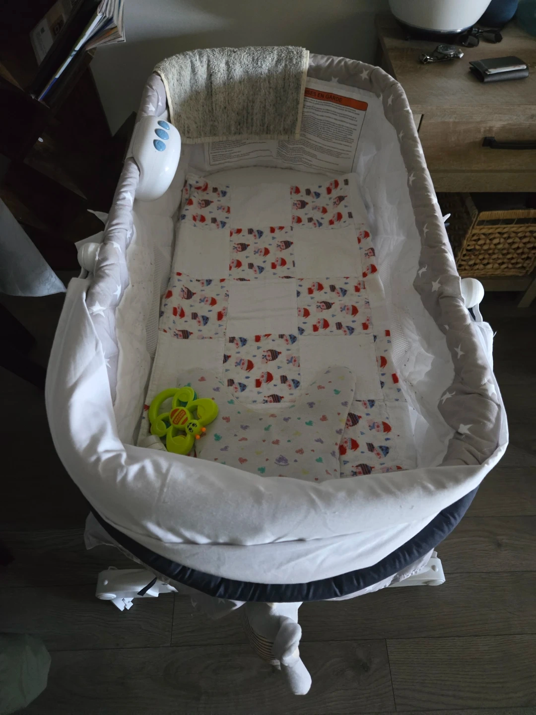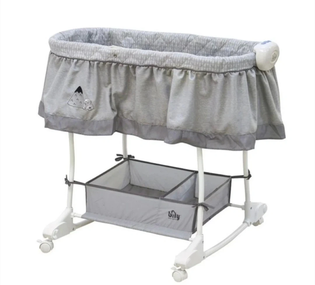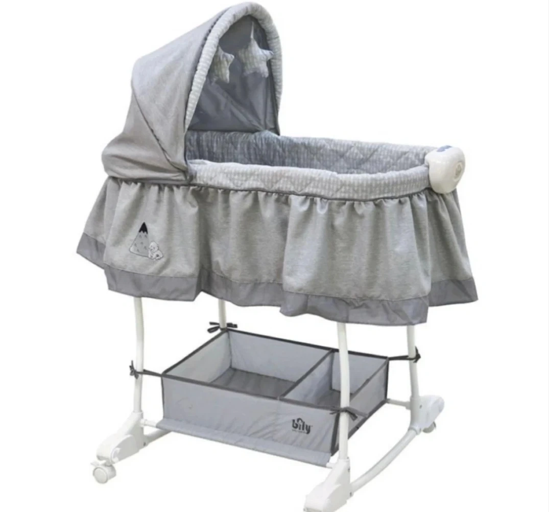 This is a grey bassinet with a white star pattern. It has a fitted sheet and a mobile. The bassinet comes with a convenient storage basket underneath. A toy is included.