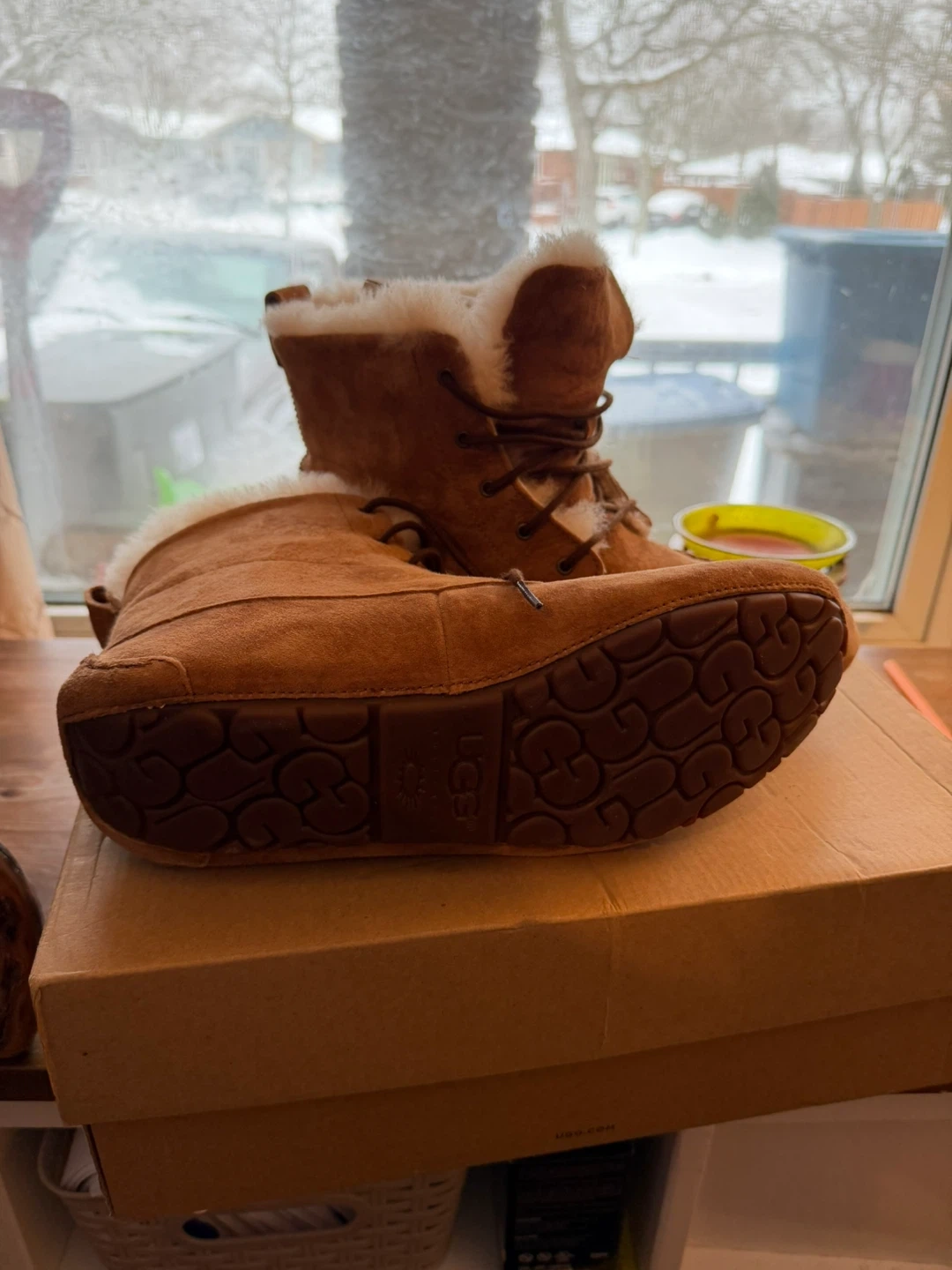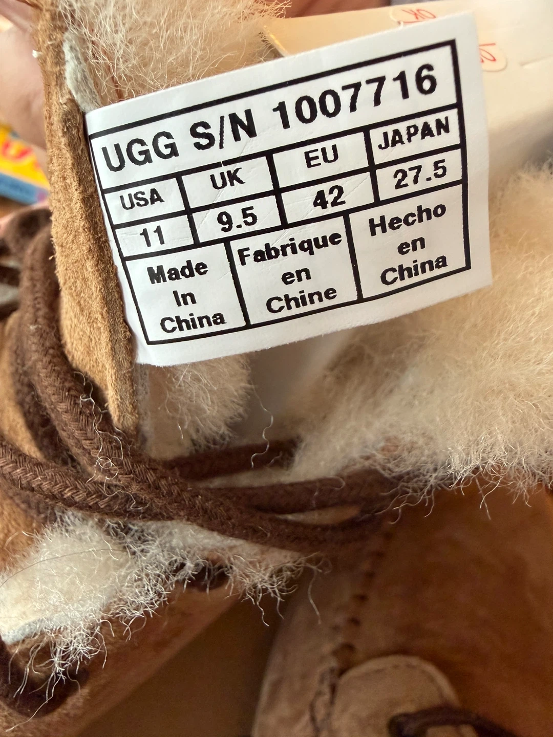 These are brown suede UGG boots with a fluffy lining. They feature lace-up detailing and have a rubber sole. Made in China.