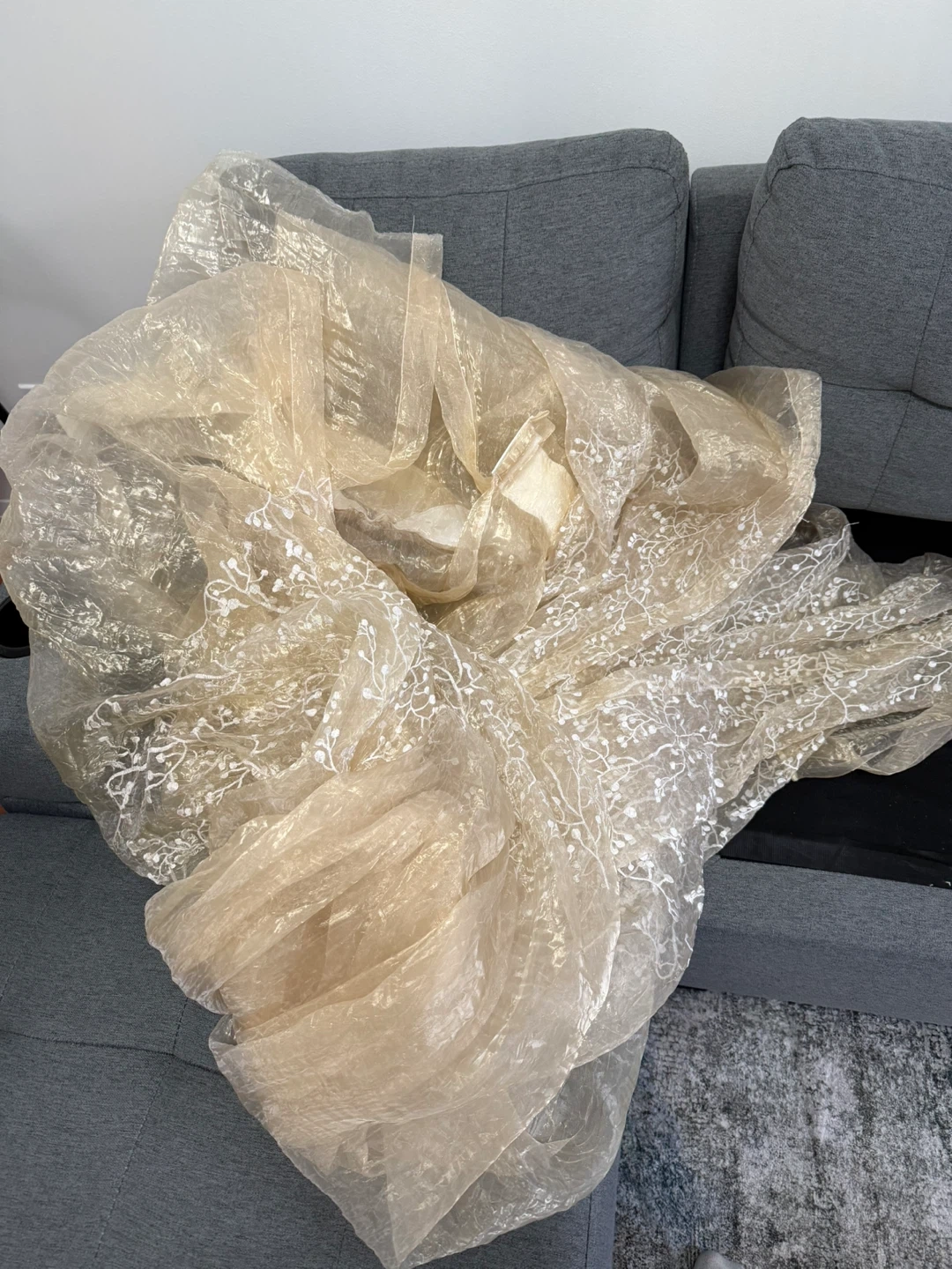 Sheer curtains with delicate gold embroidery. Fabric is lightweight and lets in plenty of light. Adds an elegant touch to any room!